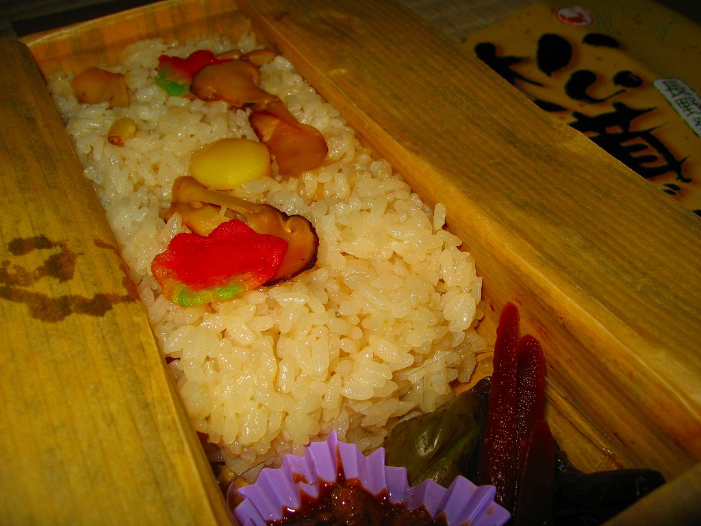 松茸は薄く小さいのが3切れしか入らず、見栄えでは一瞬ガッカリするものの、松茸御飯そのものの豊かな香りと柔らかな食感は、なかなかのもの。販売期間は秋季限定、というより10月限定ではないかと思われるが、調製元が駅弁を含む食品事業から撤退したため、今後に販売されることはない。