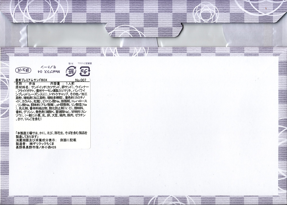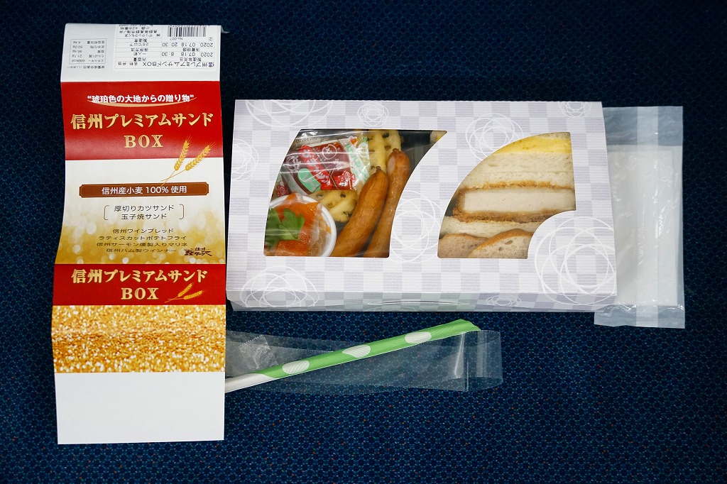 2019(令和元)年の7月までに発売か。同年のJR東日本の駅弁キャンペーン「駅弁味の陣2019」へ新作駅弁としてエントリー。近年は駅弁ではほとんど見られなくなった、おかずを入れたサンドイッチ。窓から中が見える紙箱には、おしながきを兼ねた掛紙を巻く。中身は厚切りカツサンドと玉子焼サンドが各1切れと信州ワインブレッド、ラティスカットという網目模様のポテトフライ、信州サーモン燻製入りマリネ、信州ハム製ウインナー2本。値段と分量の設定が難しそうだが、駅弁が多様性を失わないよう、こんな創作があってよい。価格は2020年の購入時で700円、2023年時点で800円、2024年10月時点で900円。