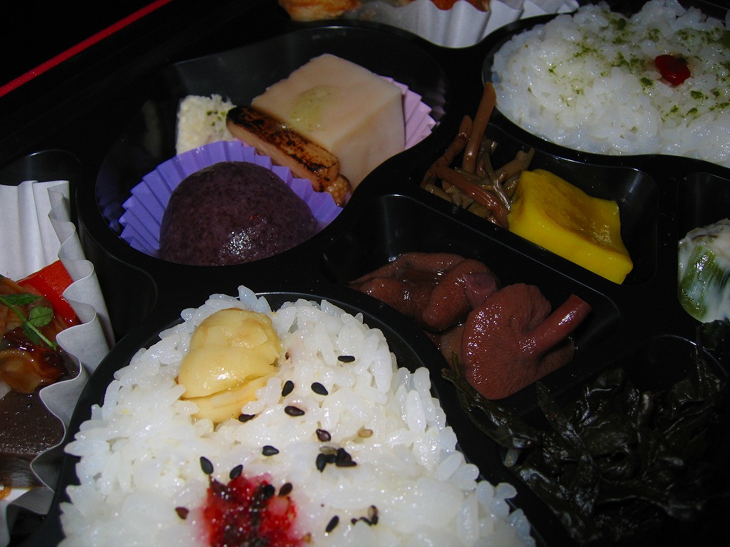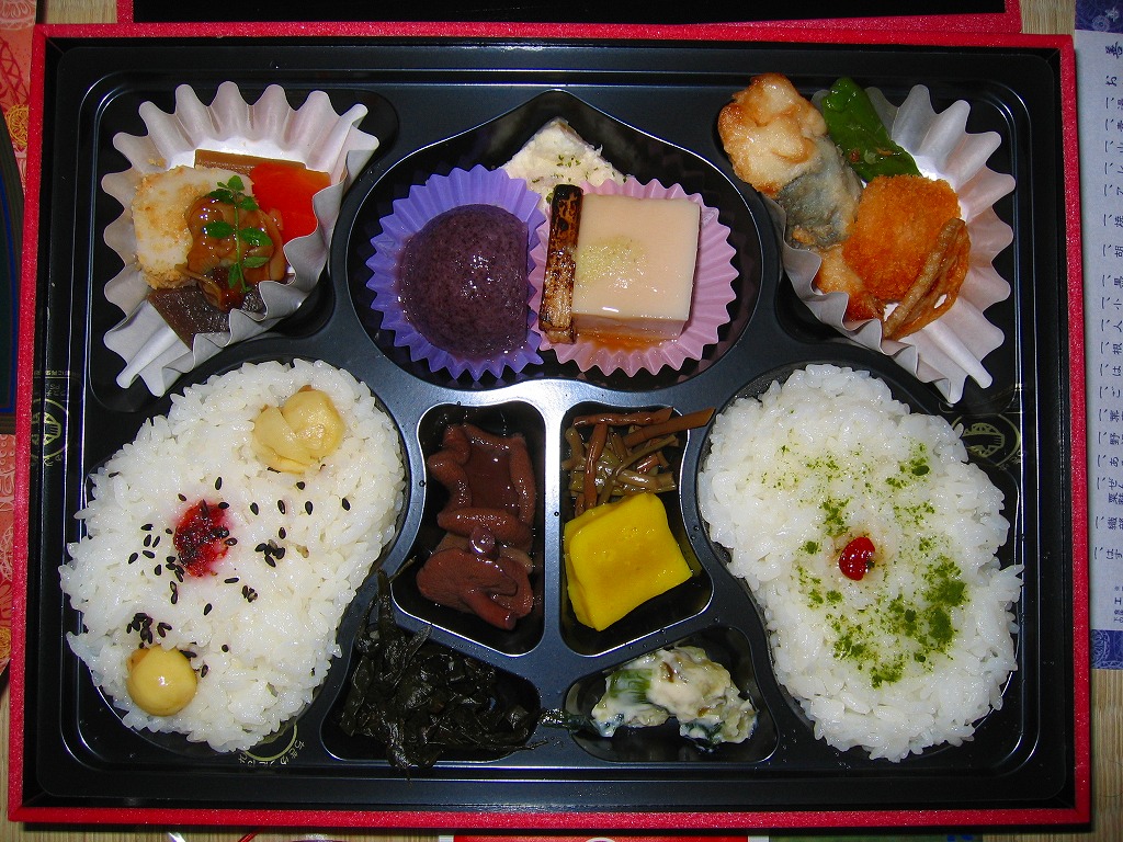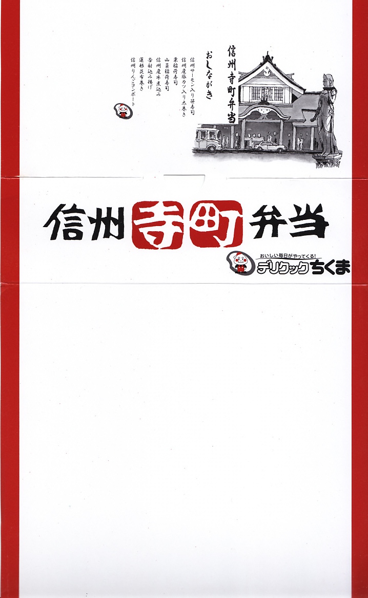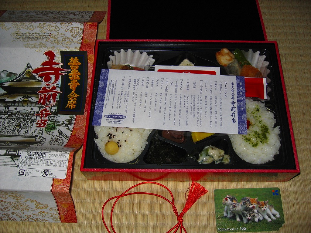 2002(平成14)年11月のリニューアル。赤い豪華絢爛な感じの柄を持つ長方形の容器に善光寺を描いた掛紙をかけてゴムひもでしばる。中身は精進料理になっており、湯葉フライや山芋磯部揚、鮭リンゴ焼揚や山菜、胡麻豆腐や黒米むし、織部ごはんとはすの実ごはんなど全16品。そのコンセプトによりおかずに困る感じもするが、見た目や善光寺御公許という立場を裏切らない風味と品質の良さがあり、これが千円ならお買い得。