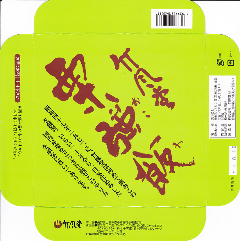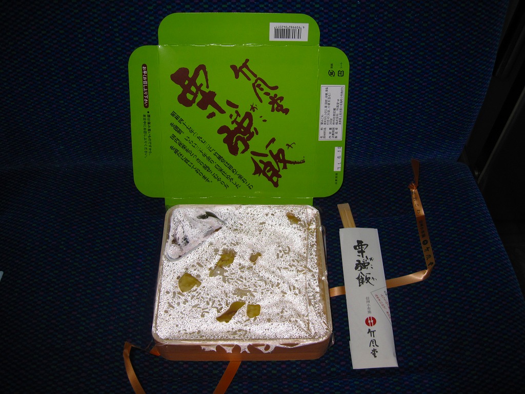 いつから駅売りされているかは分からないが、商品としては1972(昭和47)年に発売したそうな。中身は商品名のとおり、栗おこわに漬物を添えるだけという自信作。見た目に素朴で上品だが、甘味がちょっと強かったような。調製元の竹風堂(ちくふうどう)は小布施で老舗の栗菓子屋。同じものが直営店で売られており、これは駅弁ではなく郷土の名物である。