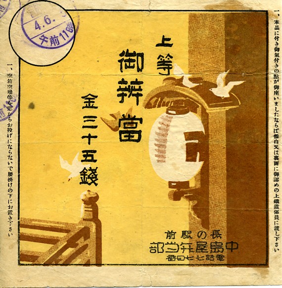 1929(昭和4)年6月5日11時の調製と思われる、昔の長野駅弁の掛紙。鳩と寺院と欄干と提灯が描かれているので、おそらく善光寺を表していると思うのだが確証はない。また、調製印が3つも押されているのは面白い。