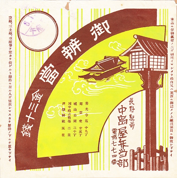 1931(昭和6)年1月31日の調製と思われる、昔の長野駅弁の掛紙。扇形を背景に、善光寺の本堂と灯籠らしきものを描く。他に刈萱堂(かるかやどう)、城山公園、川中嶋古戦場、戸隠神社を名所として並べた。