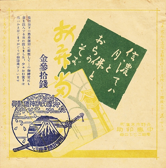 昭和10年代、1940年前後のものと思われる、昔の長野駅弁の掛紙。収集者は1941(昭和16)年10月12日の調製とみなしていた。善光寺への道と「信濃では月と佛とおらのそば」の俳句を描いた平時の掛紙に、国民精神総動員のスタンプと節米に関する記述を追加し、戦時の掛紙になった感じ。