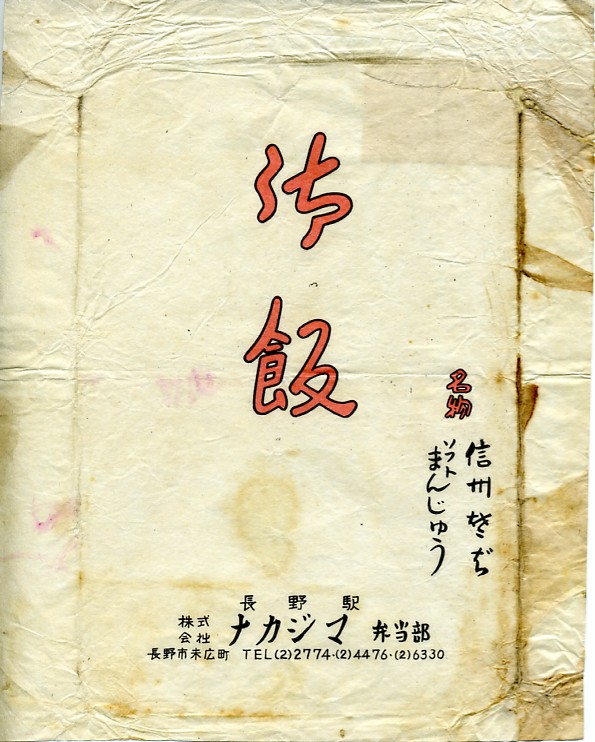 1960年代、昭和35年以降の調製と思われる、昔の長野駅弁の掛紙。長野市に市内局番ができた1960(昭和35)年頃より後のものだろう。ご飯とおかずが別容器の幕の内弁当の、御飯に付いていた掛紙だと思われる。文字以外には真っ白で何もない、駅弁に興味がなければ確実にゴミになりそうな紙切れ。
