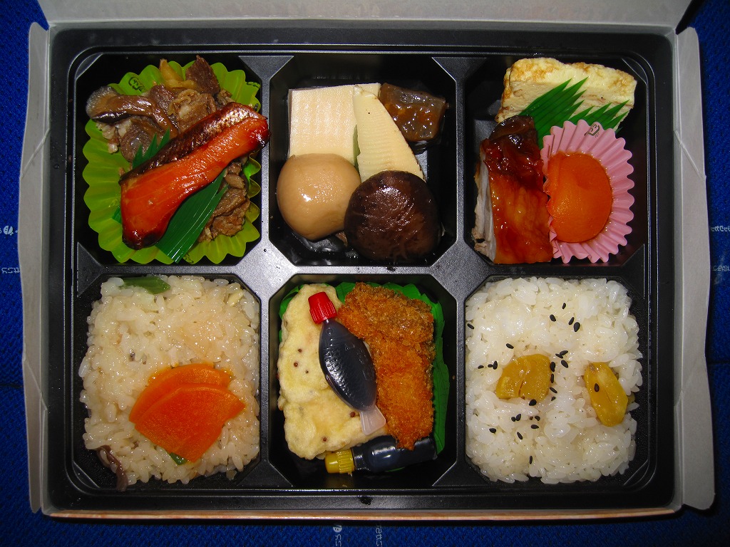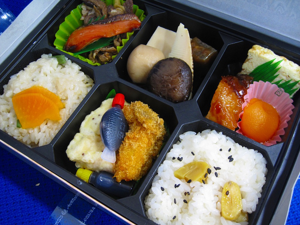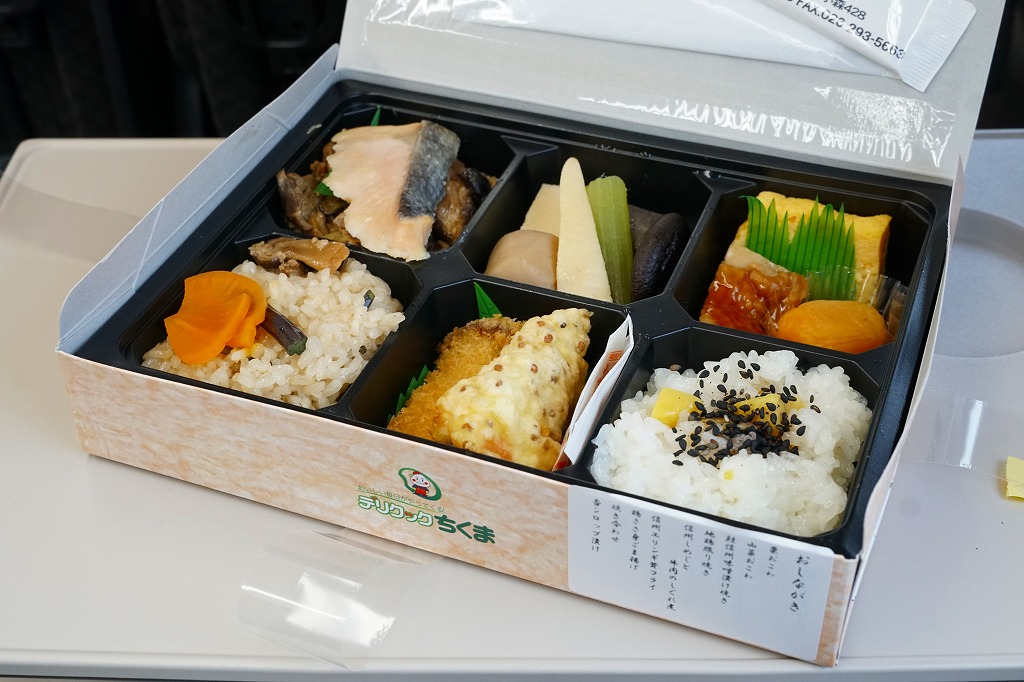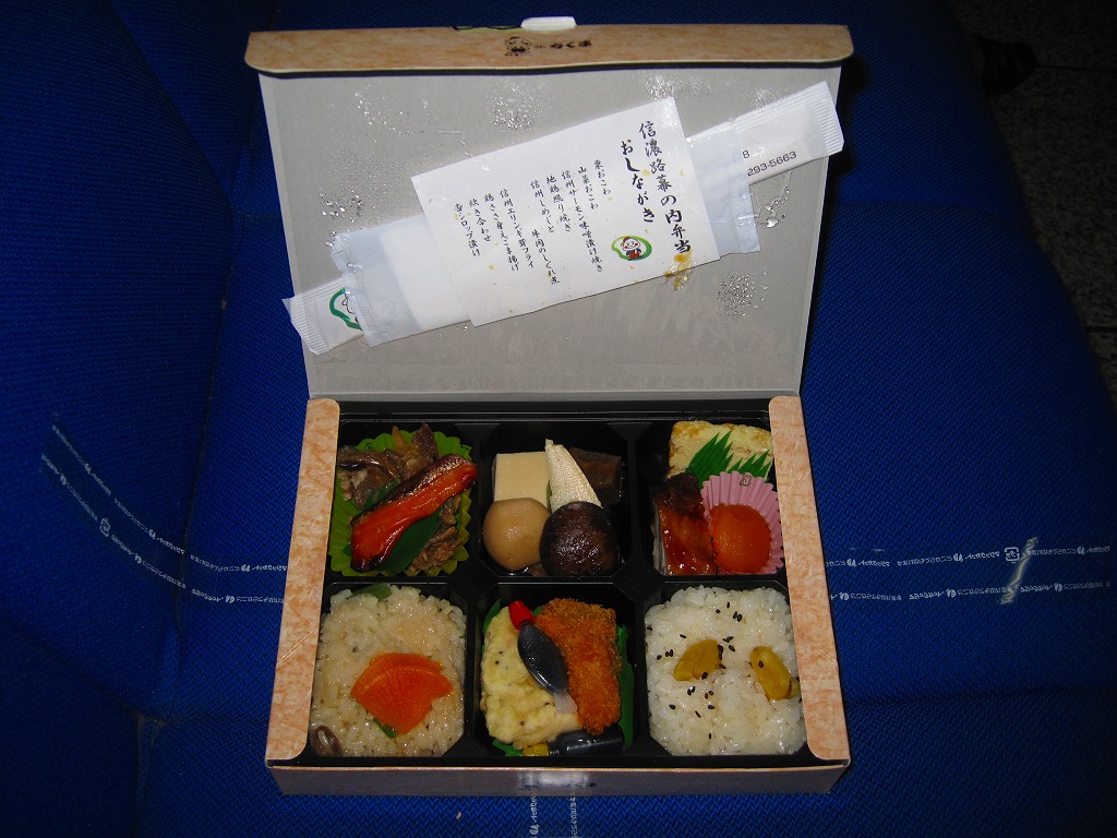 2007(平成19)年6月に長野駅で発売。長野県やいくつかのイラストを描いた専用のボール紙箱を使用、黒いプラ製トレーの6区画に詰まる中身は、山菜おこわ、栗おこわ、サトイモや高野豆腐などの煮物、牛肉とシメジのしぐれ煮にサーモン味噌焼、エリンギのフライと鶏えごま揚、地鶏照焼と玉子焼とあんずシロップ漬。特殊駅弁と呼ばないまでも、幕の内の定義からはみ出した好印象。調製元は長野市内の給食業者だが、これに仕出し弁当や惣菜弁当の雰囲気はなく、駅弁としての姿形と風格を備えていると思う。価格は2010年時点で1,000円、2016年時点で1,100円、2023年時点で1,200円、2024年10月時点で1,350円。