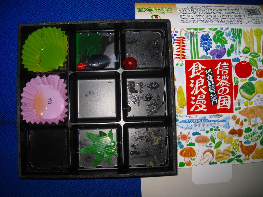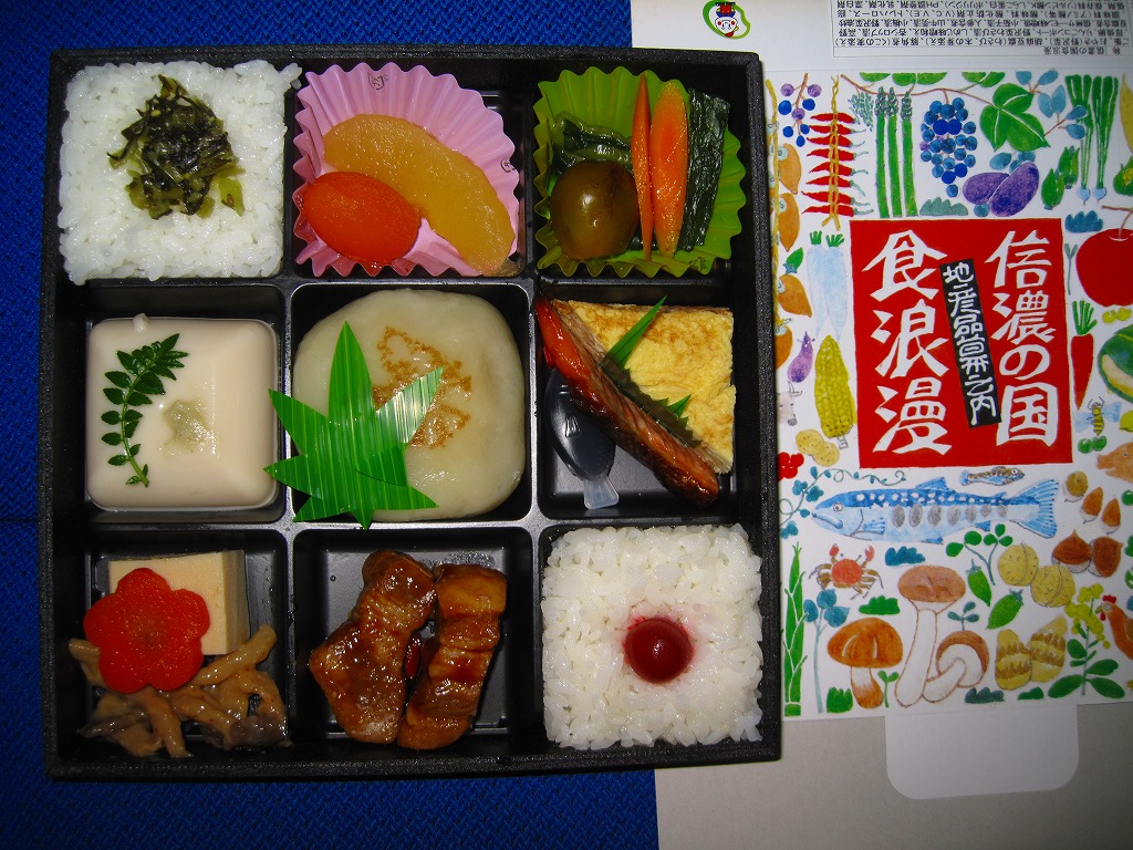 2009(平成21)年10月に長野駅で発売。黒い正方形の容器に、おそらく信濃の名物を大量に描いたボール紙を巻く。黒いプラ製トレーの9区画に詰まる中身は、野沢菜おやき、豚角煮、サーモン味噌焼と玉子焼、ごま豆腐、高野豆腐とシメジ味噌和えと花ニンジン、日の丸御飯、野沢菜載せ御飯、野沢菜や小ナスなどの漬物、りんごのコンポートとあんずのシロップ煮。確かに信州が詰まっているし、おやきをそのまま駅弁に入れてくるとは驚いた。駅弁大会に出るほどではないが、旅先に置いてほしい山の味。2014年頃までの販売か。