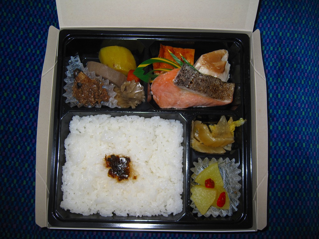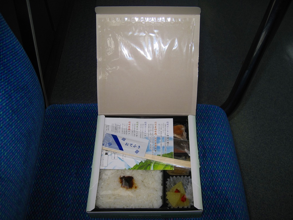2007(平成19)年の夏までに発売か。野山を拙く描いた専用のボール紙箱を使用、黒いプラ製トレーに収まる中身は、白御飯に信州サーモン粕漬け焼き、信州産福味鶏の信州味噌田楽、信州サーモン入りの玉子焼き、信州牛のしぐれ煮と野菜の彩り、信州林檎のコンポートなど。コンセプトや使用食材のこだわりがあるも、内容は幕の内駅弁らしいもの。