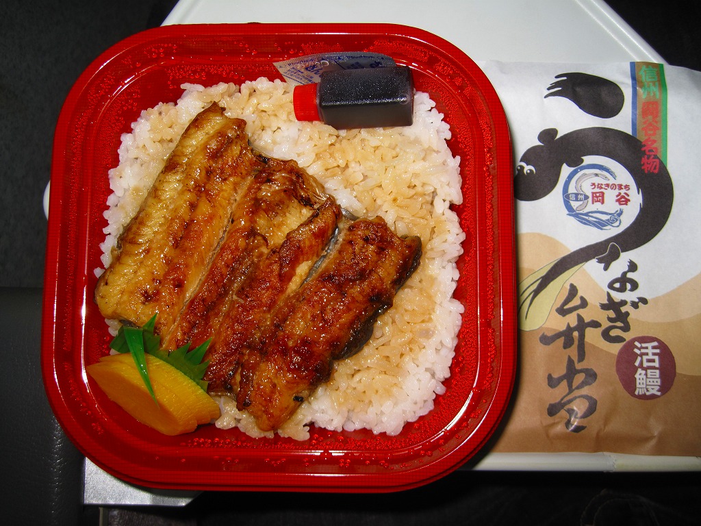 2005(平成17)年2月14日に、約3年半ぶりの岡谷駅の駅弁として発売。丼もの向けのプラ製の惣菜容器に、商品名や岡谷の名前をいくつか書いた掛紙をかける。中身は白御飯に、活鰻を背開きにして蒸さず備長炭で焼きあげたというウナギ蒲焼きを載せ、たれをかけて添えて、タクアンを添えるというシンプルなもの。味は皮と分量が並、身と価格が上という印象。