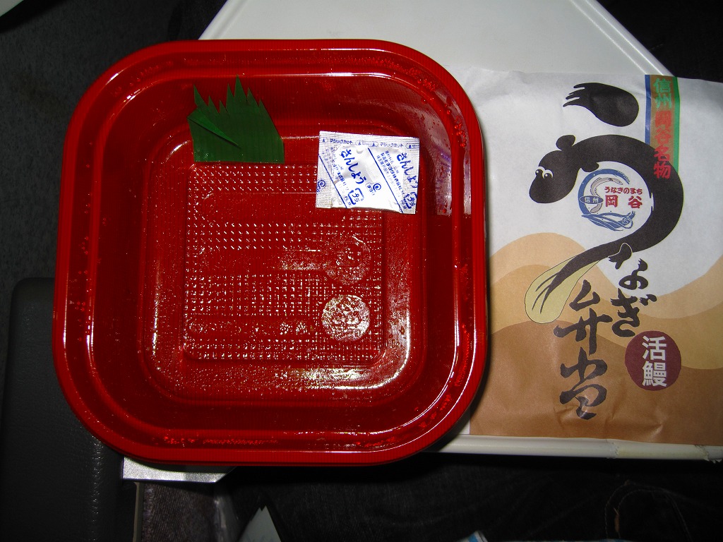 岡谷の商工会議所は、1995(平成7)年からウナギでの街おこしを目指している。かつて諏訪湖でウナギがよく獲れた名残として、岡谷市内にはウナギ屋が多いという。市内の魚料理屋の団体「うなぎのまち岡谷の会」で開発した弁当、といってもただの鰻丼であるが、JR駅のキオスクが駅弁化を要請し、こうして駅で商品化された。訪問時の岡谷駅では売店に写真を掲示するものの実物がなかったが、茅野駅で無事に購入できた。