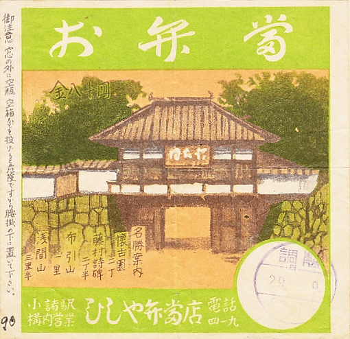1930年代の、3日16時の調製と思われる、昔の小諸駅弁の掛紙。わかりづらいが上半分で、上田市内の懐古園に現存する「千曲川旅情のうた」の歌碑を描き、下半分の松や石垣と合わせて上田城址のイメージか。