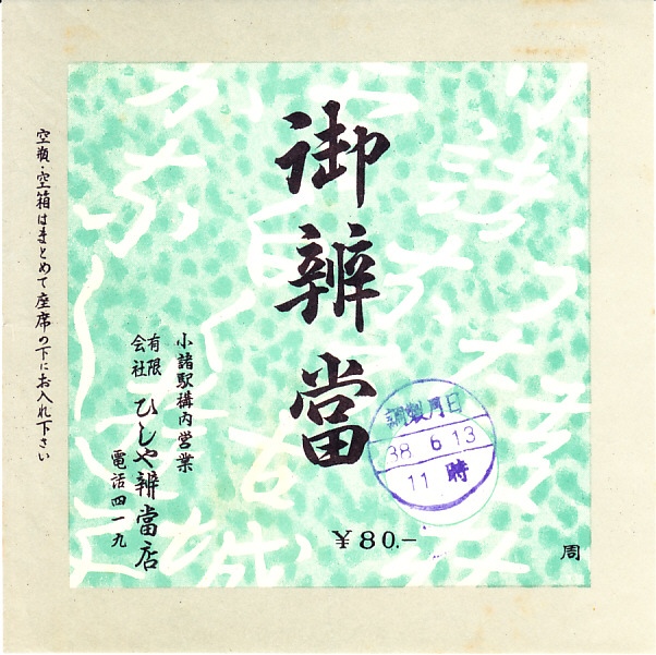 1963(昭和38)年6月13日11時の調製と思われる、昔の小諸駅弁の掛紙。品名と価格と調製元と注意書きの文字しかないが、あるいは背景に何らかの文字があるかどうか。