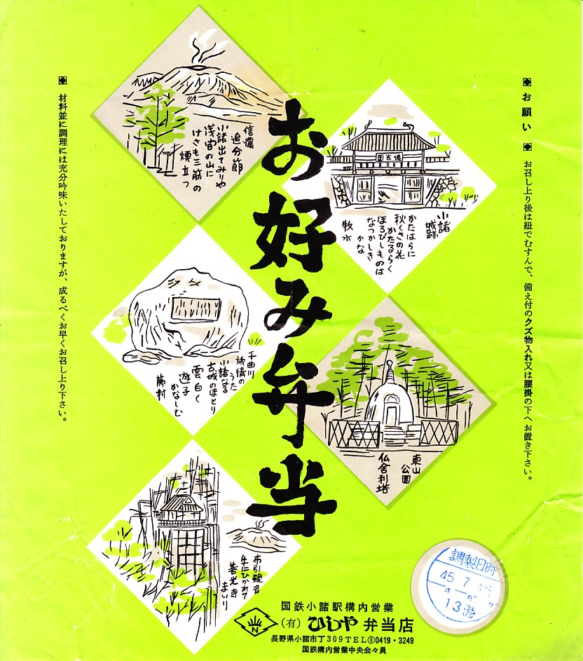 1970(昭和45)年7月15日13時の調製と思われる、昔の小諸駅弁の掛紙。信濃追分節、小諸城跡、千曲川旅情のうた、東山公園、布引観音のイラストと説明をちりばめた。