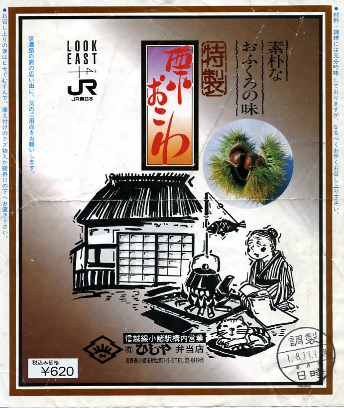 1989(平成元)年8月11日11時の調製と思われる、昔の小諸駅弁の掛紙。中身は上記の駅弁「栗おこわ弁当」と、同じだったのだろう。この調製元の栗おこわにはファンが付いていて、駅の立ち食いそば店でも惣菜として売られた。
