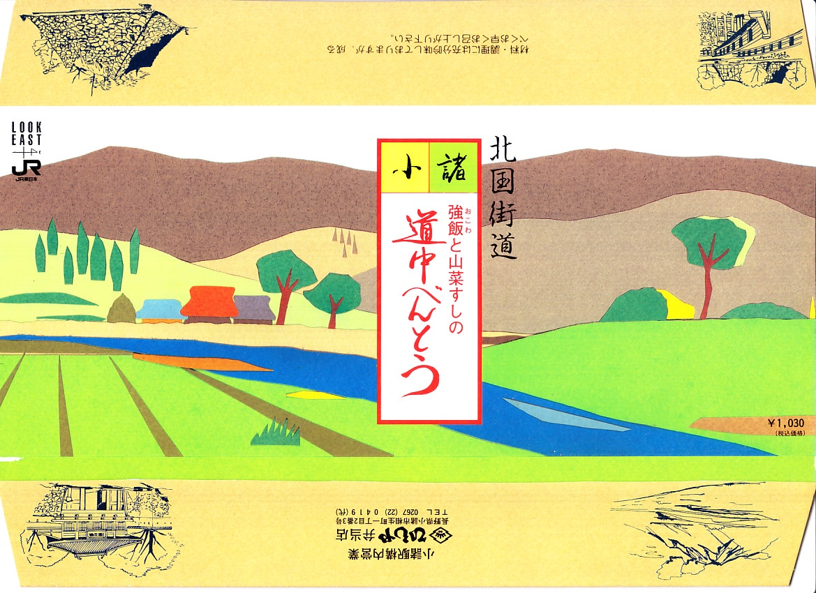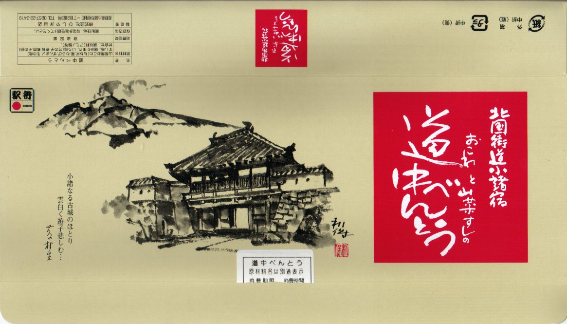 1990年代のものと思われる、昔の小諸駅弁の紙箱。山村の風景イメージを描く。この紙箱の側面に記されたイラストの一部である浅間山と小諸城三の門が、上記のとおり後の駅弁紙箱に使われた。