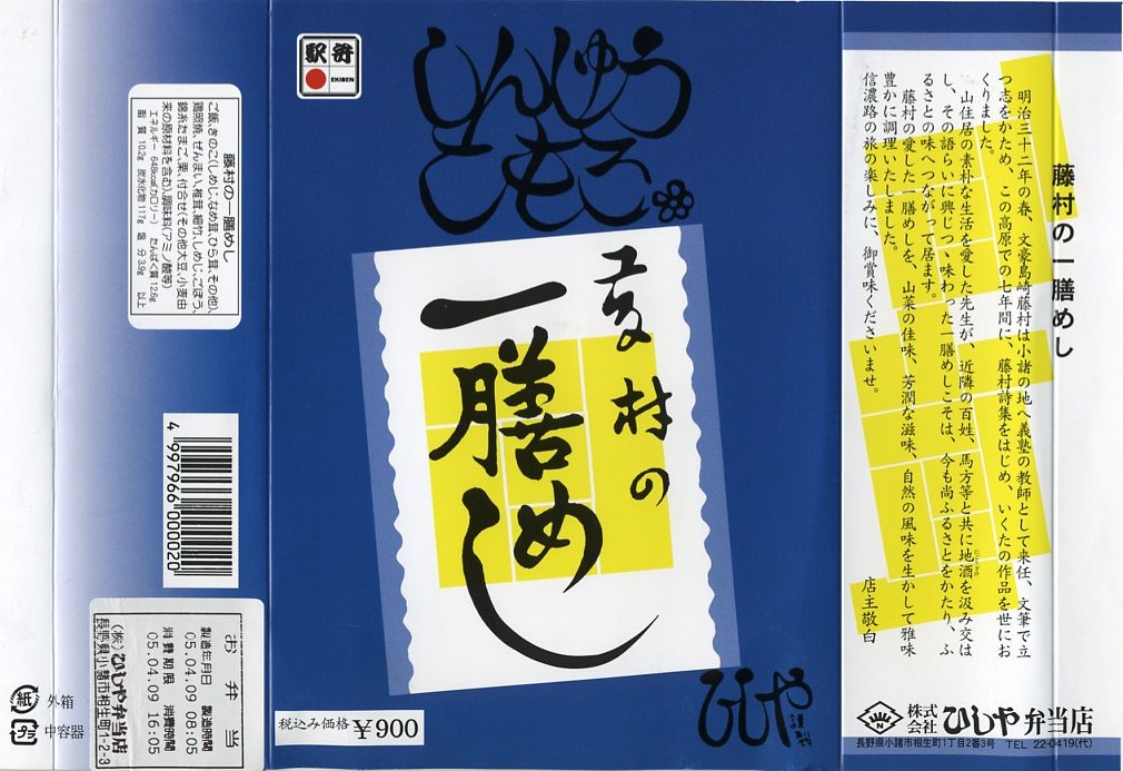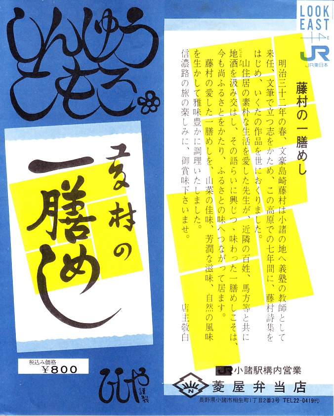 ところがおそらく今世紀に入ってからのリニューアルにより、写真のような容器が味気ないプラ製に変えられるとともに「旅情」の文字を消してしまった。掛紙の意匠と中身は変わらないものの、風情はまるでなく、旅の風味も失われた。戦前の名小説家である島崎藤村も、没後すでに暦が還り知名度が薄れつつある感じで、そんな状況がここにも顕れたのか。この駅弁は2006年頃までの販売か。