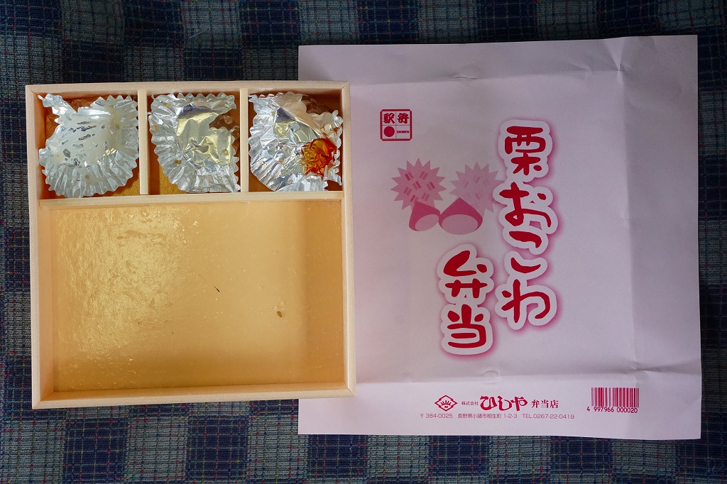 今も小諸駅前の調製元に「駅弁」の看板も掲げるが、弁当の販売はなく、駅弁は事前の予約か、この「栗おこわ弁当」を注文するかとなる。5分で出てきたアッツアツの栗おこわは、もちろん普段の冷めたり冷ました駅弁の味ではないが、これはこれでおいしいお弁当であった。調製元の廃業により、2016年12月30日限りで終売となった。