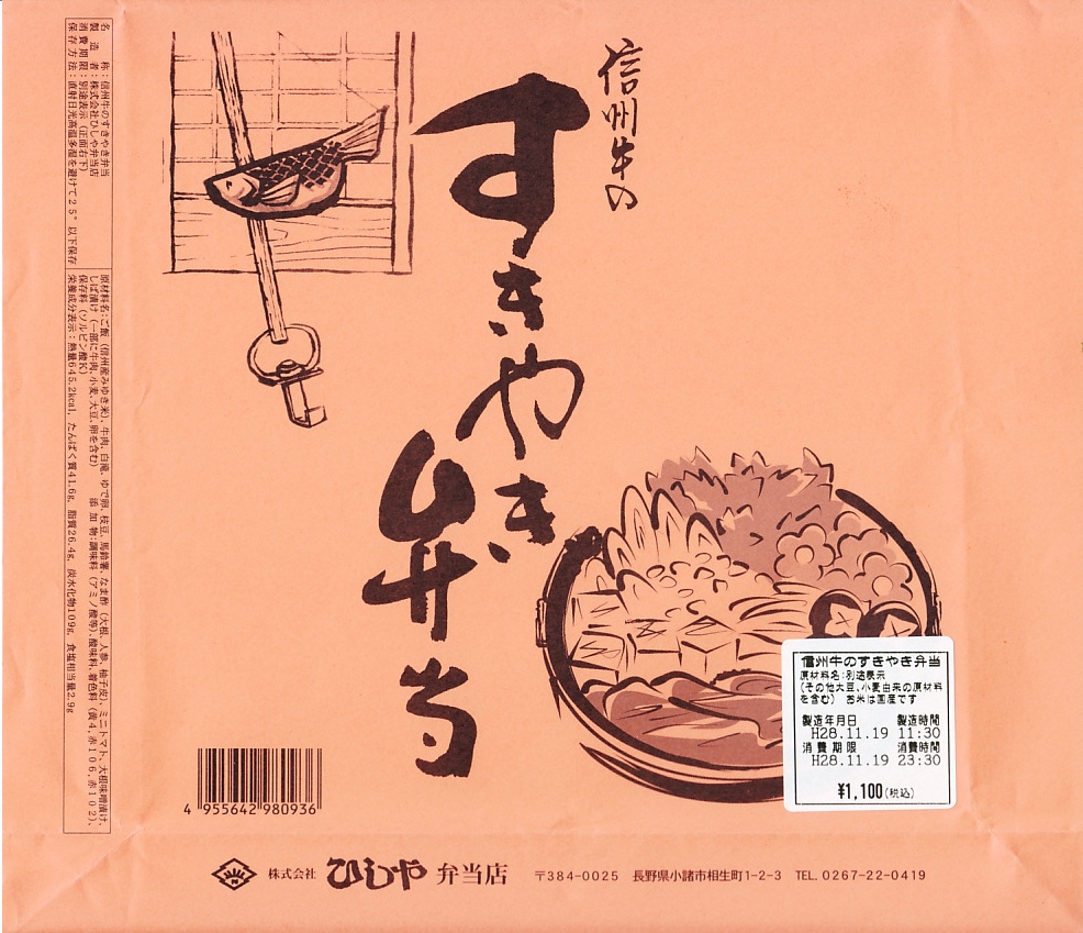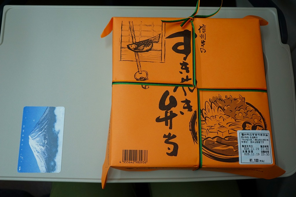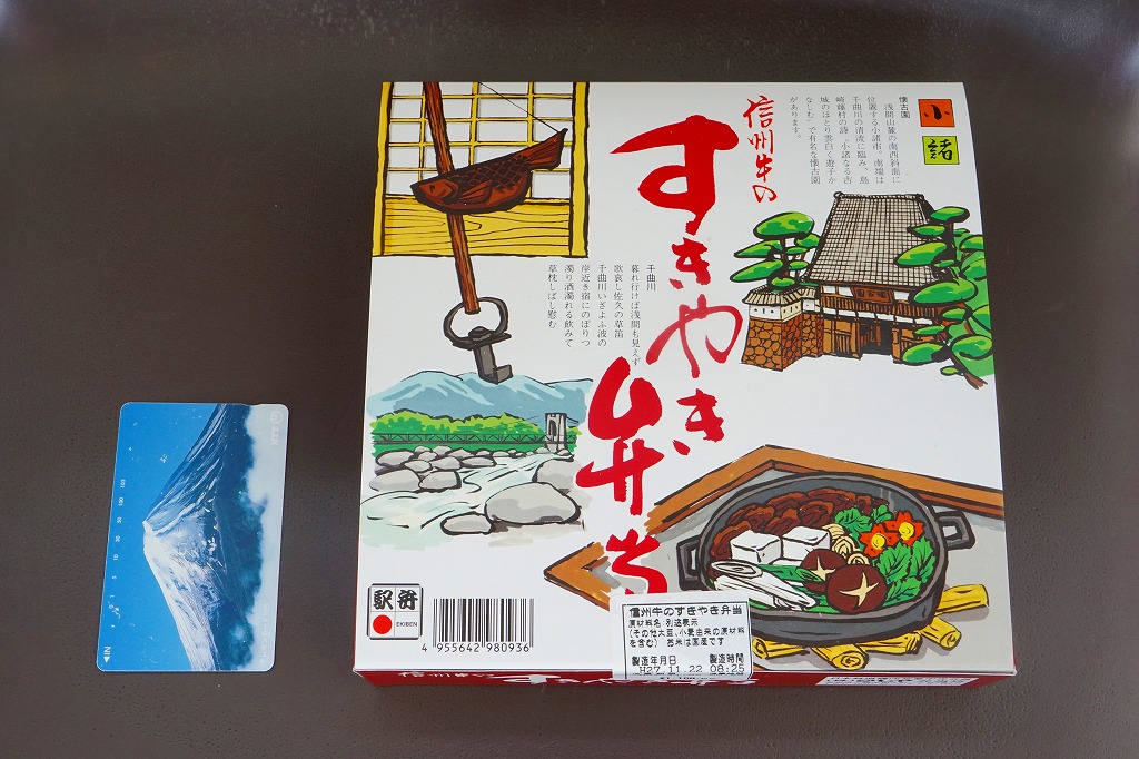 上記の駅弁「信州牛のすきやき弁当」の、2015(平成27)年11月時点での姿。中身や味や値段は変わらないが、当時の容器はボール紙製だった。紙箱が掛紙に戻ることは珍しい。いずれにせよ、今は買うことができない。