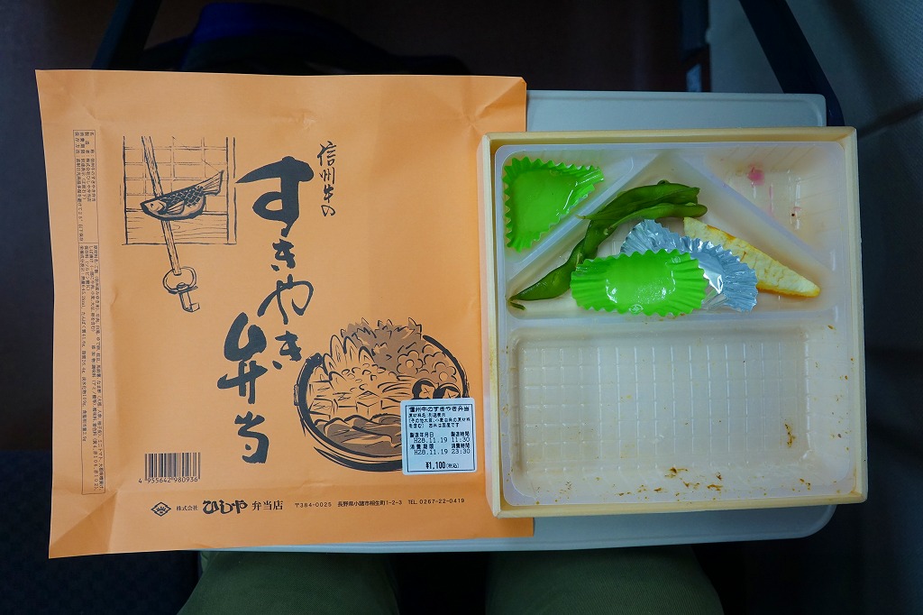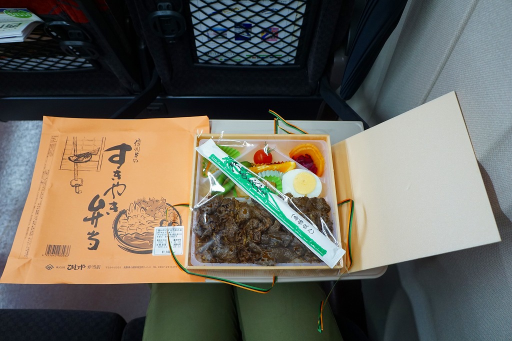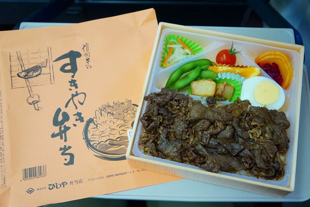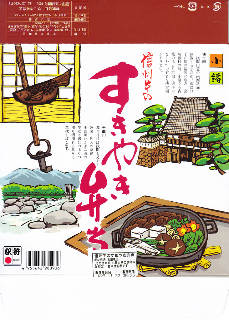 若者向けの駅弁として、1983(昭和58)年10月に小諸駅で発売。白御飯の上にシラタキを軽く載せて牛肉煮で覆い、ゆで卵、ポテトサラダ、枝豆、ミニトマト、レタス、柴漬け、大根漬などを添える。見た目は牛丼と生野菜サラダ。佃煮になりかけたような濃い赤身の牛肉煮にも、まるで生野菜サラダに見える付合せにも、独特である印象を持つ。肉は筋なく、ほどほどに柔らかく、すき焼きという感じはあまりしない。調製元の廃業により、2016年12月30日限りで終売となった。