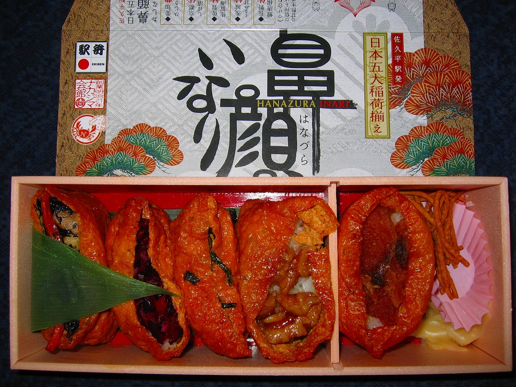 食品になじみにくそうな駅弁の名前は、長野県佐久市に実在する稲荷神社から採ったもの。諸説がある日本五大稲荷のうち、長野県佐久市の観光協会が挙げる5箇所の、愛知県豊川のひじき、京都府伏見のしば漬け、佐賀県祐徳の海苔、茨城県笠間のくるみ、長野県佐久市鼻顔の鯉唐揚が、それぞれ中身になった。風味も内容も価格も外観もコンセプトも満点で、購入者からの評価は高かったが、調製元の食品事業撤退により、2007年1月までに失われた。