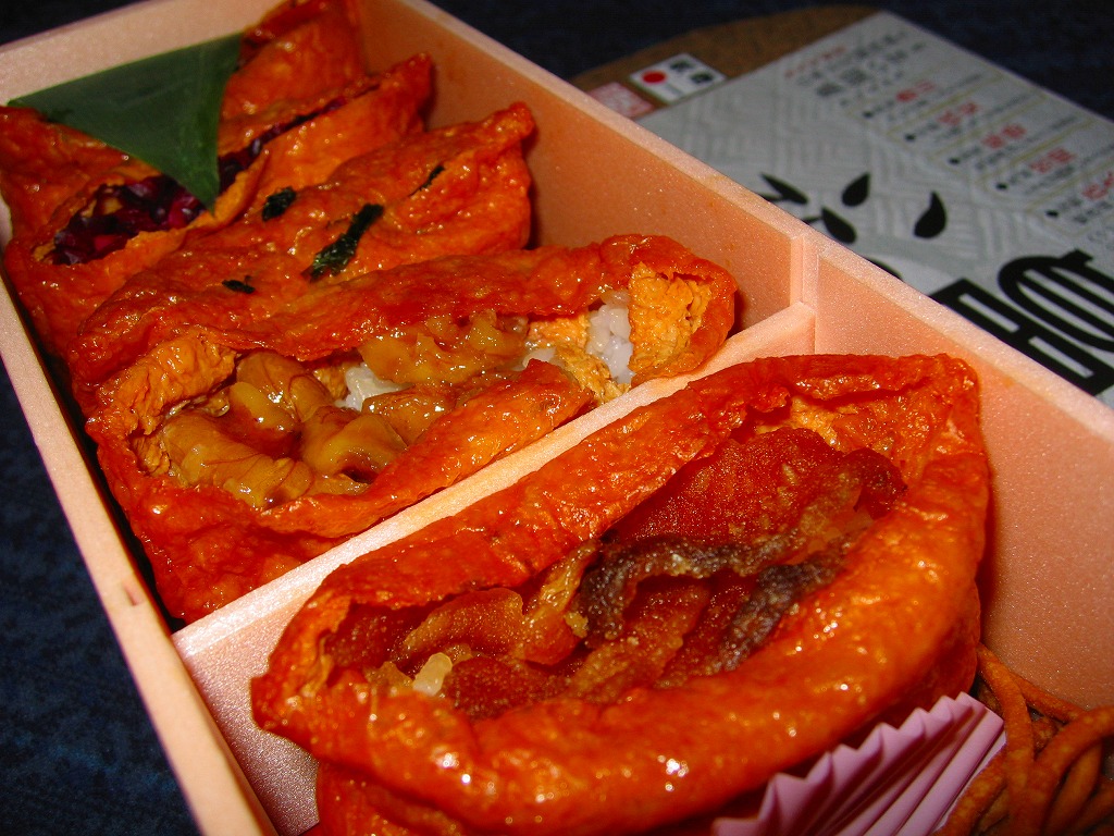 2006(平成18)年8月10日に発売。細長い容器に、中身に加えて割りばしとお品書きも詰めて、商品名や絵柄を印刷したフタと掛紙を兼ねるボール紙をかけて、セロハンテープで留める。中身は5個の大きめなおいなりさんと、そば唐揚と甘酢生姜。これを笹の葉の上に載せている。