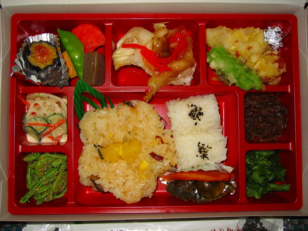コスモス畑の写真を載せたボール紙の長方形パッケージに、区画の多い真っ赤なプラスティックのトレーを入れる。中身は花型の栗おこわと俵型御飯に、佐久鯉の唐揚げ甘酢かけ、信州味噌の茄子田楽、山菜の天ぷらや切り干し大根に地鶏照焼など。メインの鯉は衣にしか感じられず、パッケージに「松花堂風」と記載しながら中身のどこが松花堂なのか疑問なものの、それを見なければ幕の内ユースな駅弁として風味と雰囲気のよい内容。揚げ物に塩を別添するなど、弁当ではなく料理を提供する姿勢を感じる。価格は購入時で1,000円、2015年時点で1,080円。