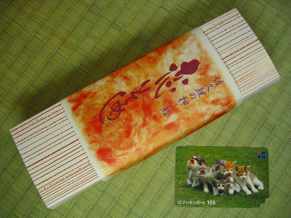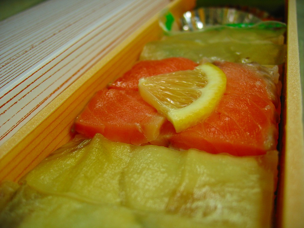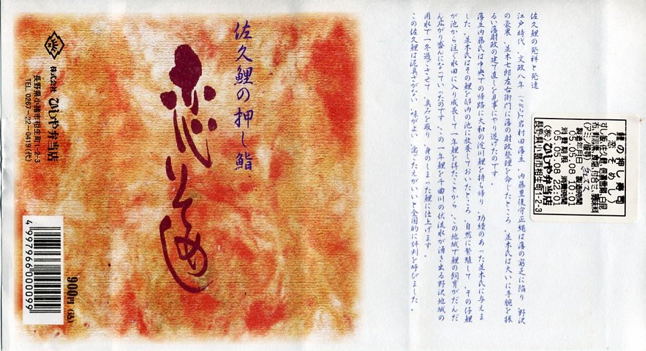 国内で残るのはここだけではないかと思われる、コイの押寿司の駅弁。鯉4個と鮭2個のバッテラで1本分の棒寿司となり、これをコンパクトで細長い容器に詰めてボール紙の筒に収め、駅弁の名前と佐久鯉に関する文章を書いた掛紙を巻く。特段の感想のない風味だが、逆にえぐみも臭みもない普通の押寿司にできたことこそが最大の特徴だと思う。2005年までの販売か。