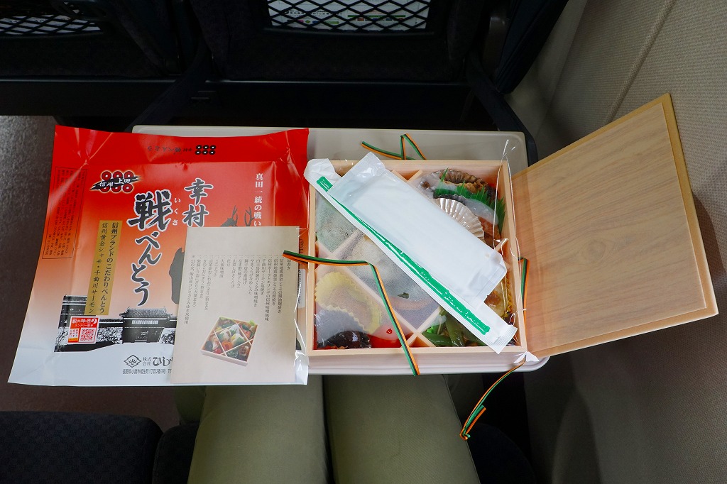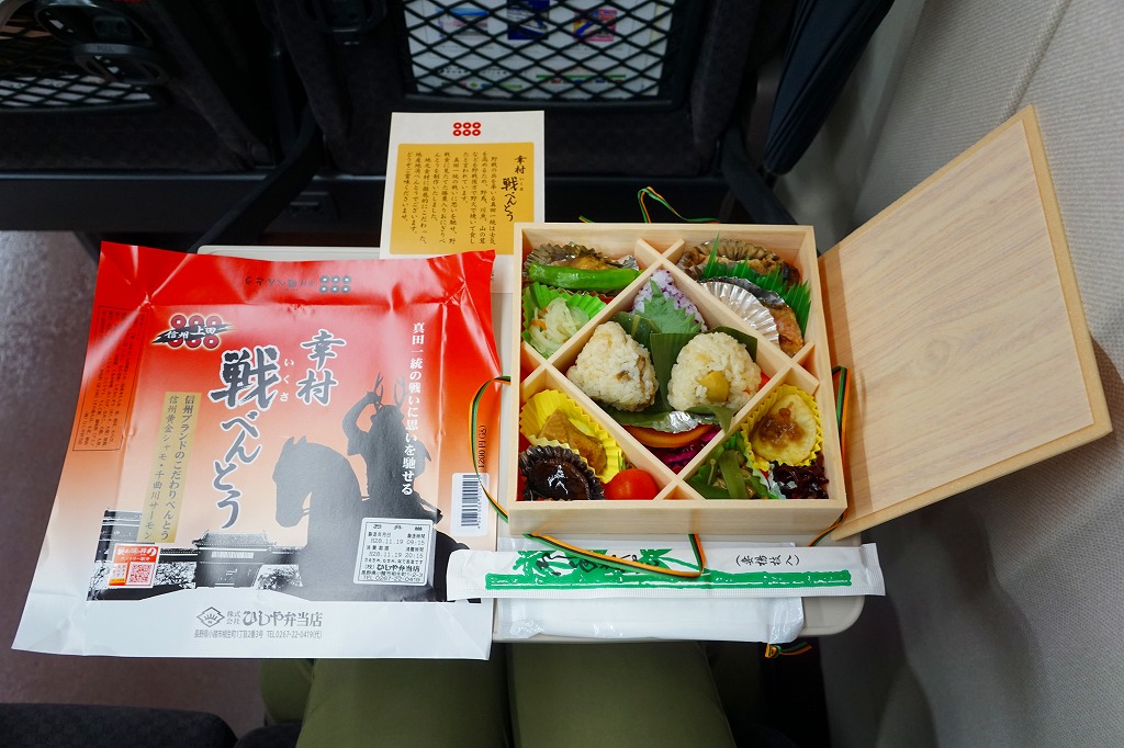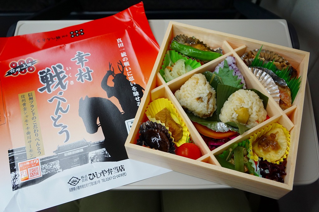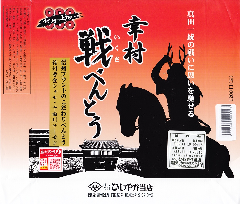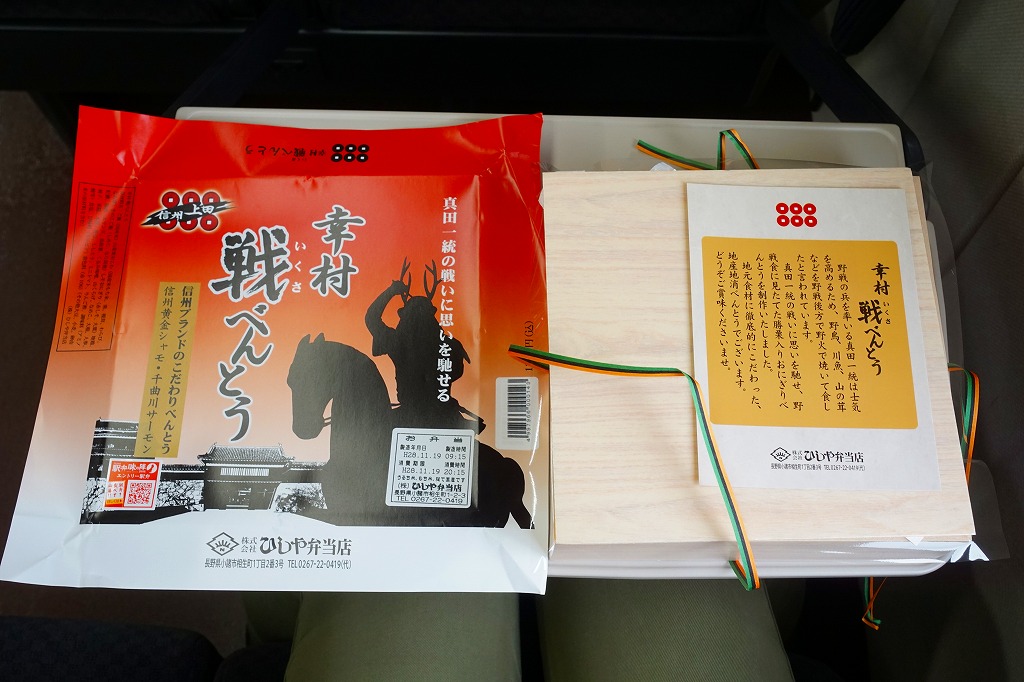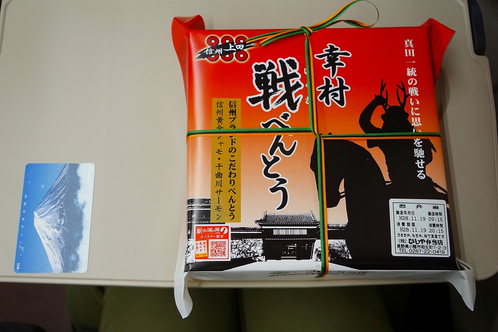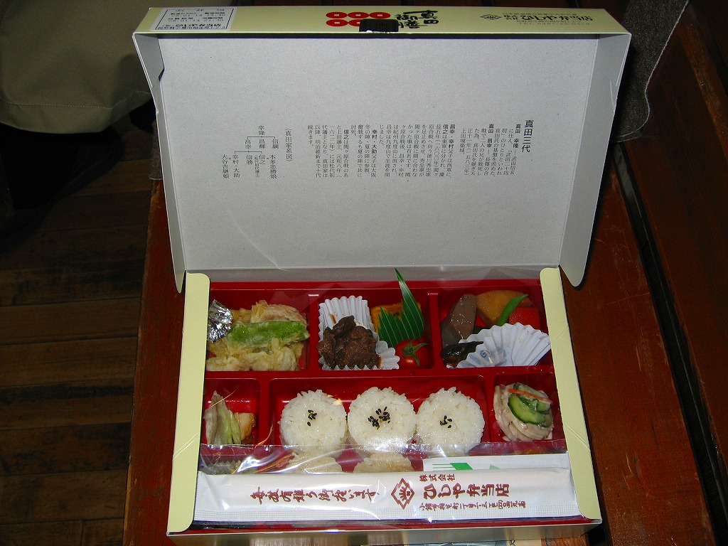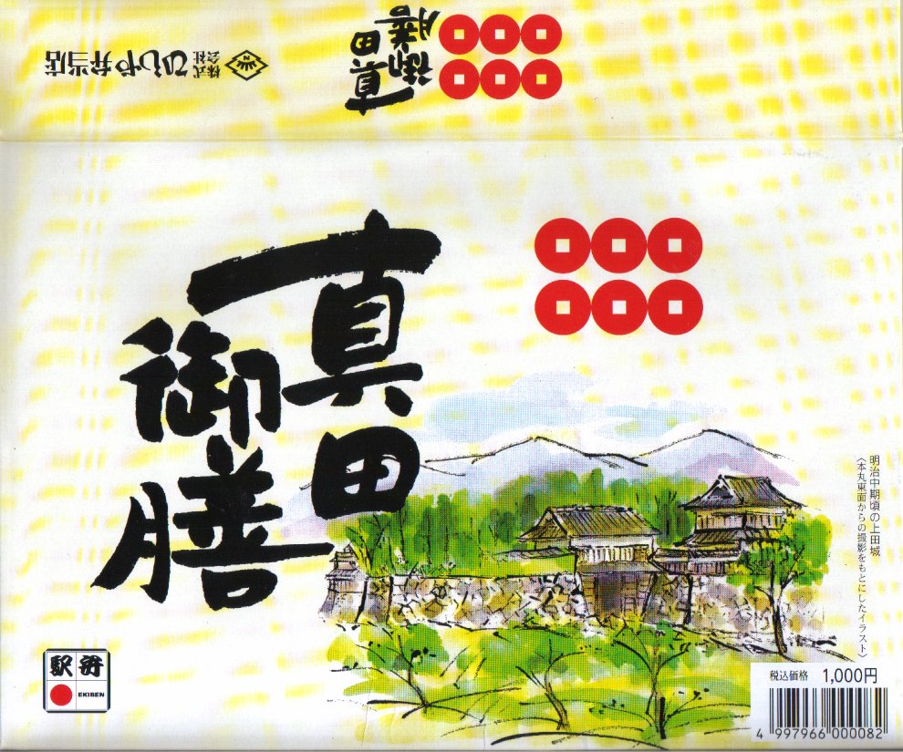 2015(平成27)年の年末に発売か。2016(平成28)年のNHKの大河ドラマ「真田丸」に乗じた駅弁か。掛紙には、上田城と真田幸村と思われる騎馬の鹿角の武将と真田家の家紋「六文銭」を描く。中身はキノコと山菜とシソで3種のプチおむすびに、信州地鶏黄金シャモの醤油麹焼きと照焼き、信州ポークとエリンギの信州味噌風味、千曲川サーモン塩焼き、白土馬鈴薯のくるみ味噌焼、野菜や山菜や漬物など。