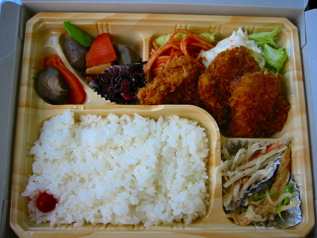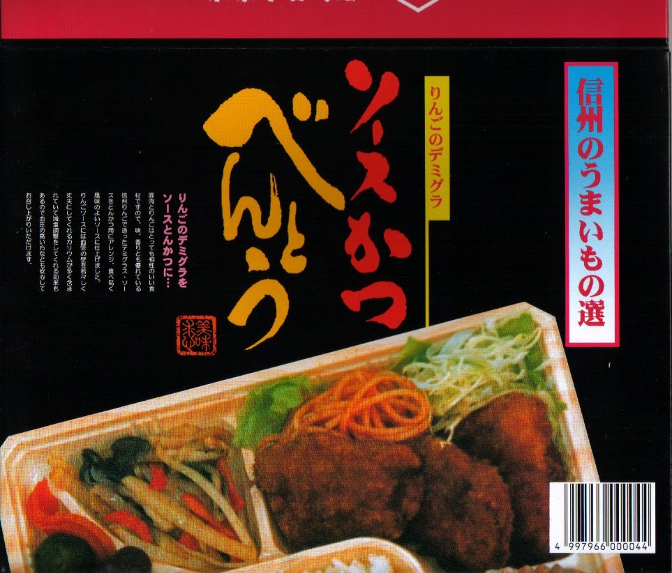 弁当箱には見えない厚手で光沢のある菓子折のようなボール紙を容器に使用し、その中に木目調のトレーを入れる。中身は梅干しが隅にいる白御飯に、信州りんごで作ったデミグラスソースが衣に染み込んだカツがひとくちサイズで3個入る。また、他にはポテトサラダやスパゲッティが添えられる洋風な面と、煮物に漬物が入る和風な面の両方を持つ。