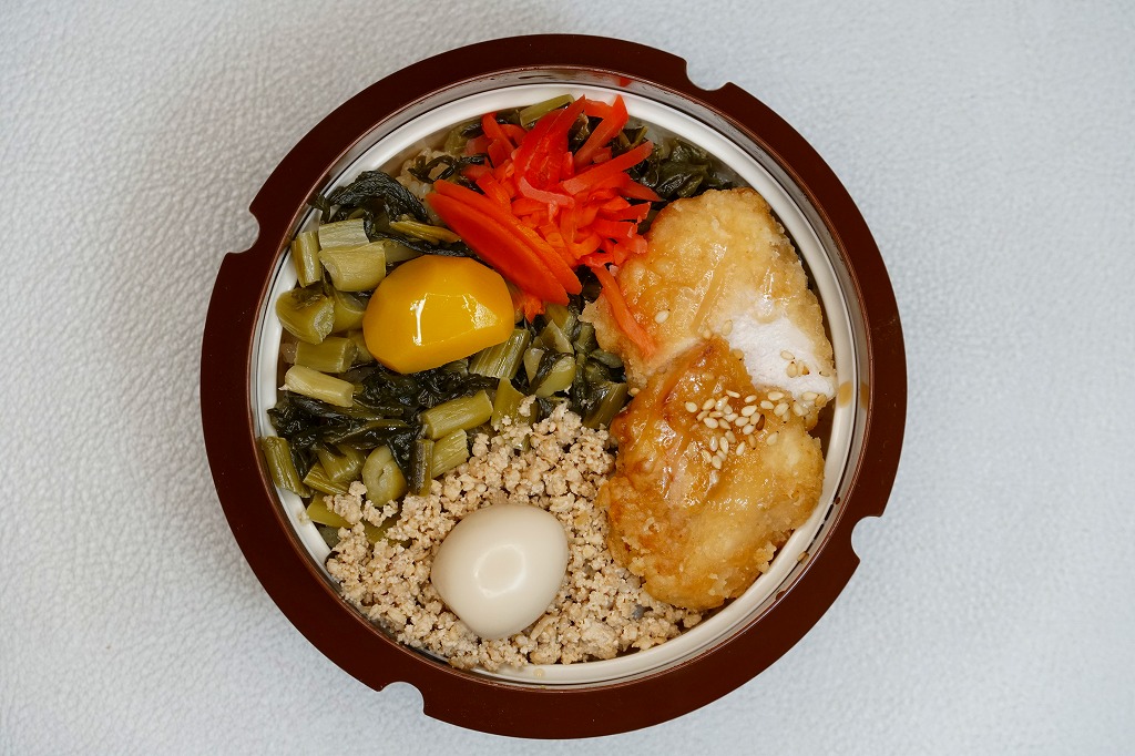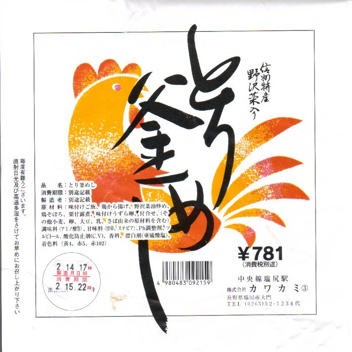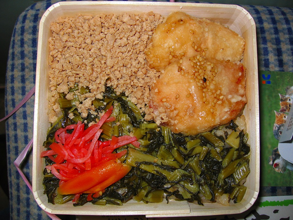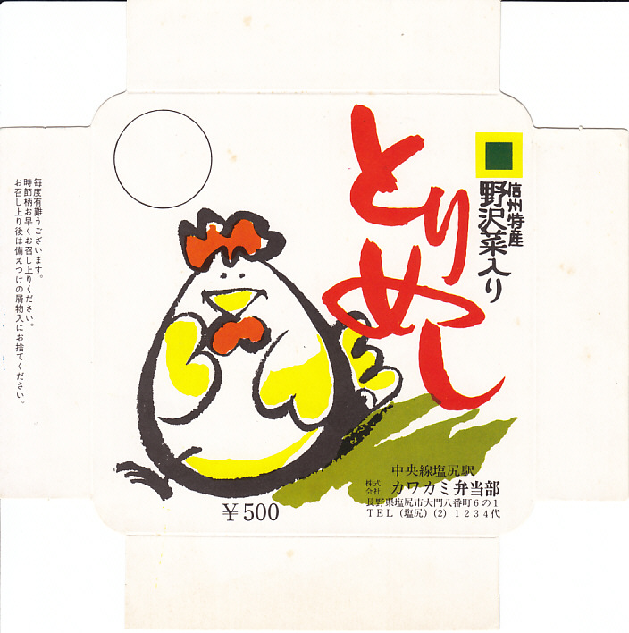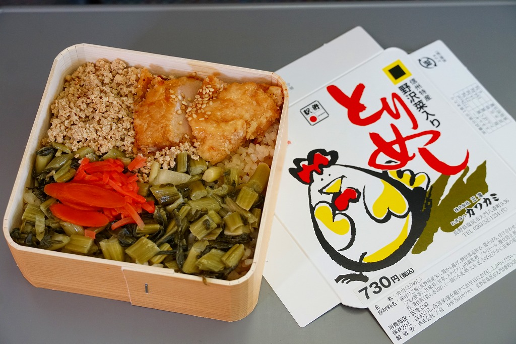 1953(昭和28)年の発売という、塩尻駅弁のロングセラー。やや上げ底な正方形の容器に味付けご飯を詰め、野沢菜炒め、鶏唐揚、鶏そぼろで覆い、紅生姜と漬物を載せる。たっぷりの野沢菜を含め、飯も肉も油っぽいところが特徴で、この味が70年もの間親しまれる。ニワトリを卵形に描くふたの絵柄も昭和時代から変わらず、塩尻駅や松本駅の駅弁売店で見つけやすい。2023年時点で一日あたり1000個から3000個くらいが売れるという。価格は2005年時点で610円、2015年時点で650円、2021年時点で700円、2023年時点で730円。