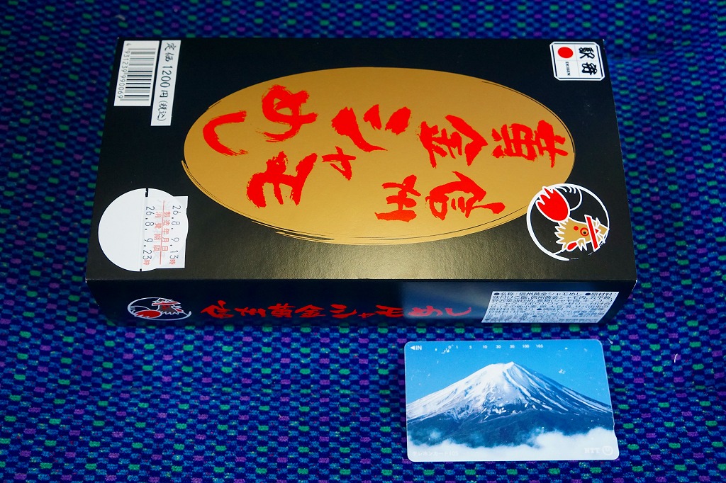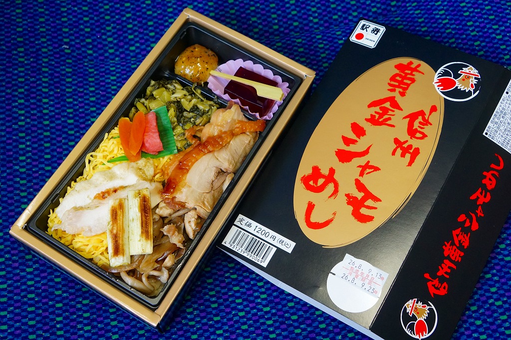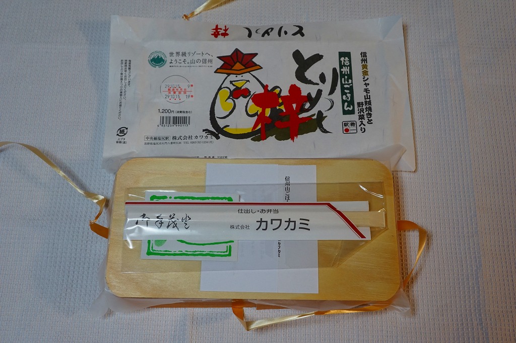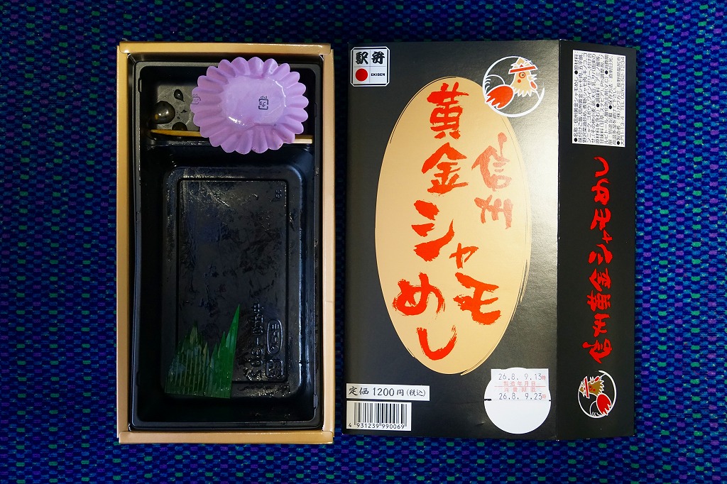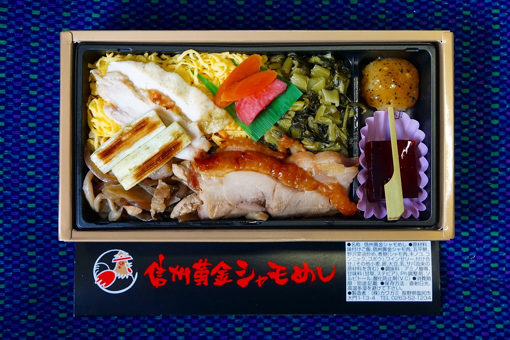 2010(平成22)3月の発売か。長方形の容器に鶏ガラならぬシャモガラスープで炊いた茶飯を詰め、野沢菜の油炒め、錦糸卵、信州黄金シャモ肉の照焼と煮物の各2切れ、ネギや糸こんにゃくやマイタケなどで覆い、五平餅とワインゼリーを添える。つまり鶏飯。信州黄金シャモの照焼は締まってうまく、価格が高いためか他の食材の種類や見栄えも類例よりさすがに優れているが、どこかを略して千円になれば、駅弁として買いやすくなると思った。2021年までの販売か。