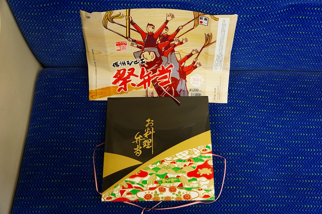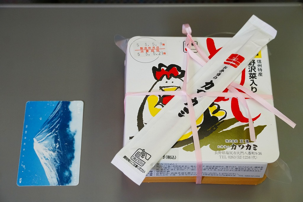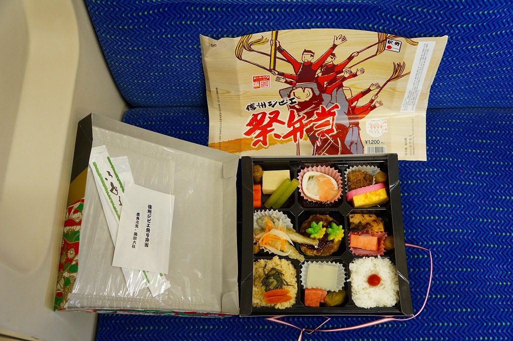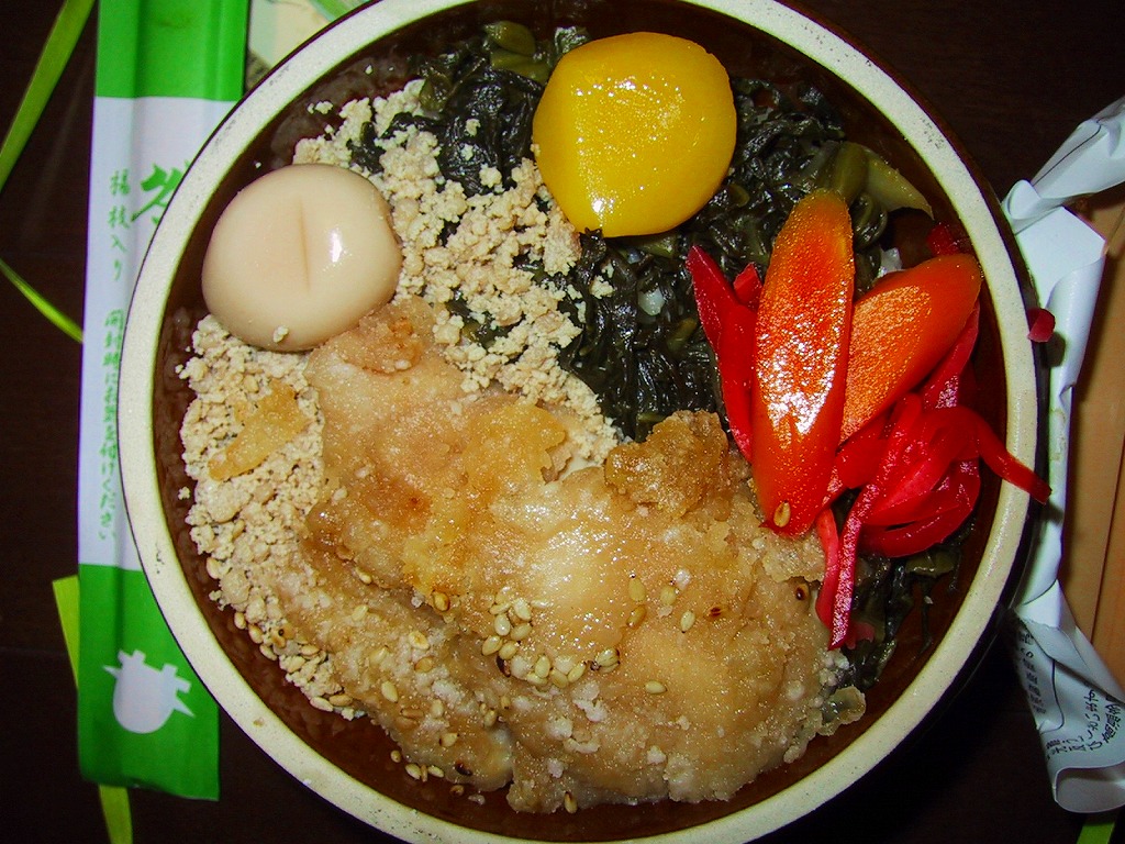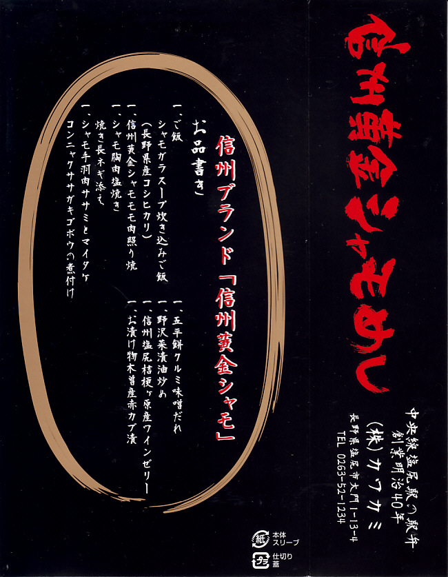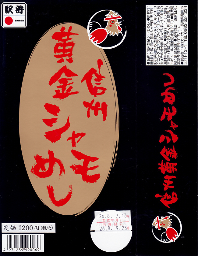 2010(平成22)3月の発売か。長方形の容器に鶏ガラならぬシャモガラスープで炊いた茶飯を詰め、野沢菜の油炒め、錦糸卵、信州黄金シャモ肉の照焼と煮物の各2切れ、ネギや糸こんにゃくやマイタケなどで覆い、五平餅とワインゼリーを添える。つまり鶏飯。信州黄金シャモの照焼は締まってうまく、価格が高いためか他の食材の種類や見栄えも類例よりさすがに優れているが、どこかを略して千円になれば、駅弁として買いやすくなると思った。2021年までの販売か。