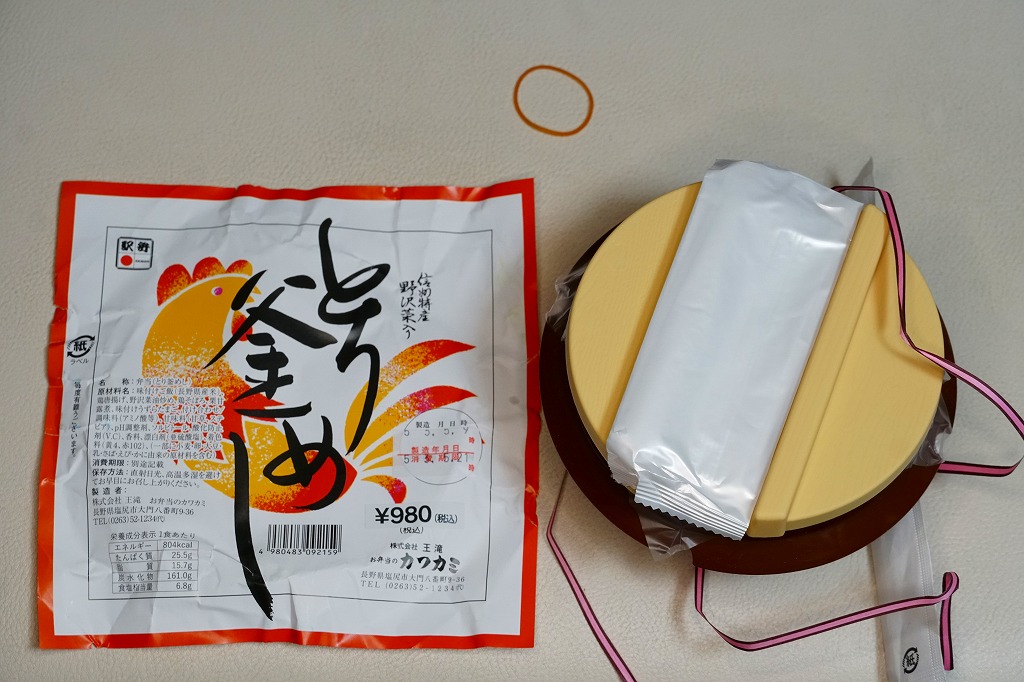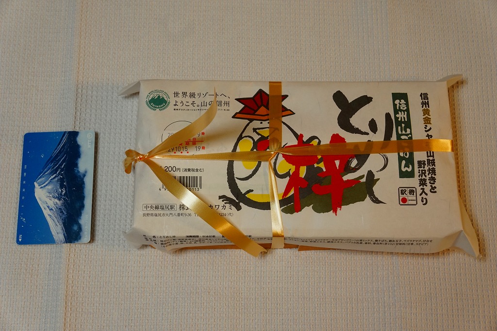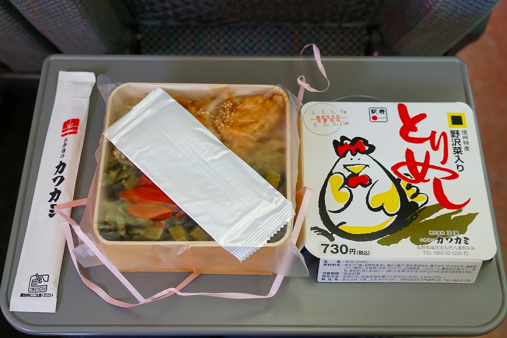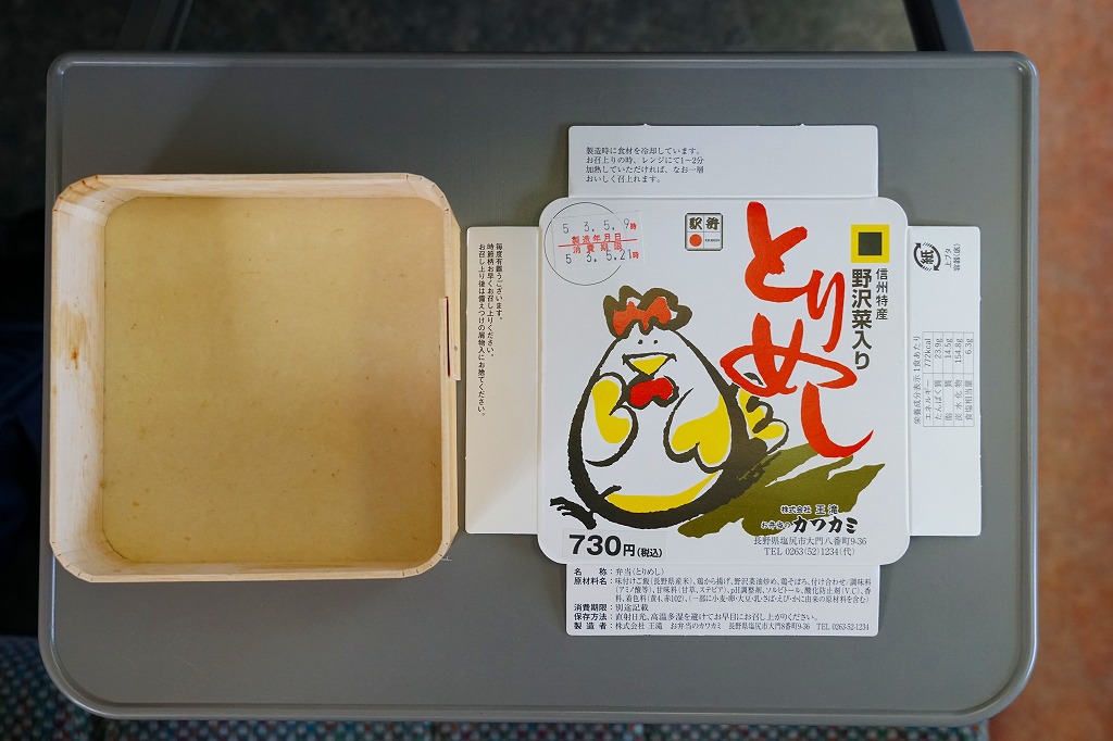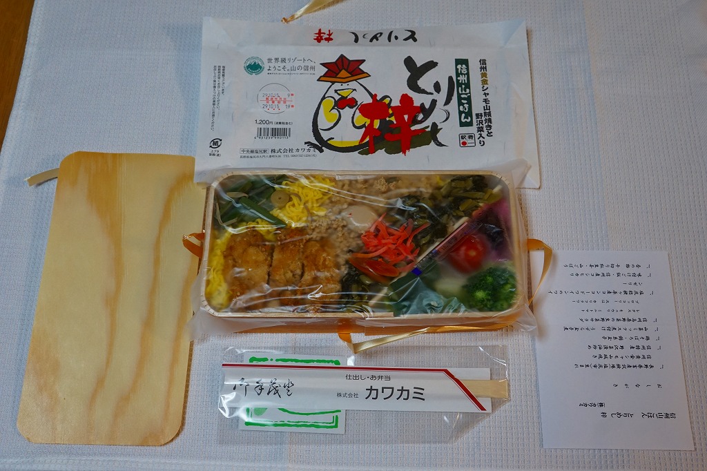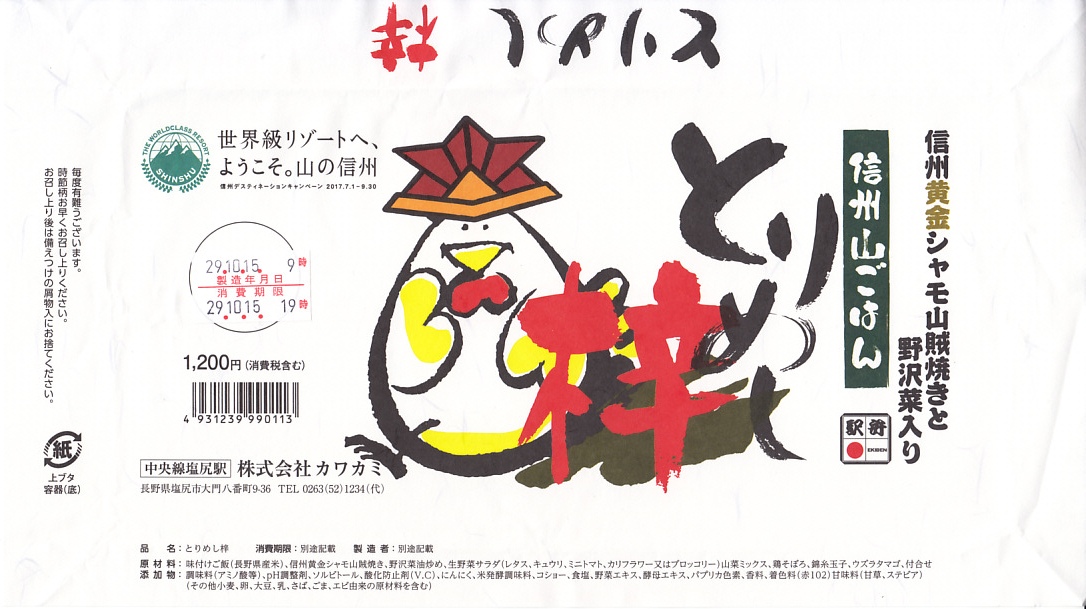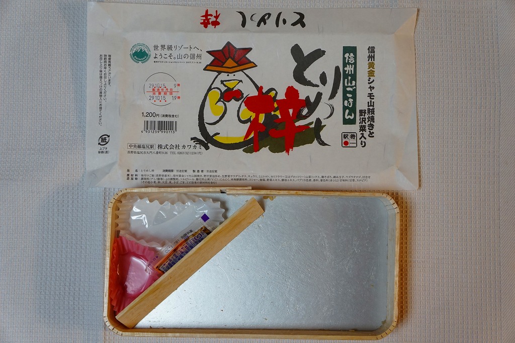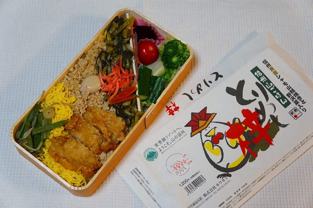 横に細長い容器に、茶飯を敷き、とりそぼろと鶏照焼、野沢菜の油炒め、錦糸卵、山菜、紅生姜で覆い、生野菜サラダとワインゼリーを添える。その内容はまるで、まるで既存の塩尻駅弁「とりめし」の拡大版。掛紙の絵柄も似ているし、だいたい1.5倍くらいの分量が入り、ざらついて油っぽい味も健在。2020年までの販売か。