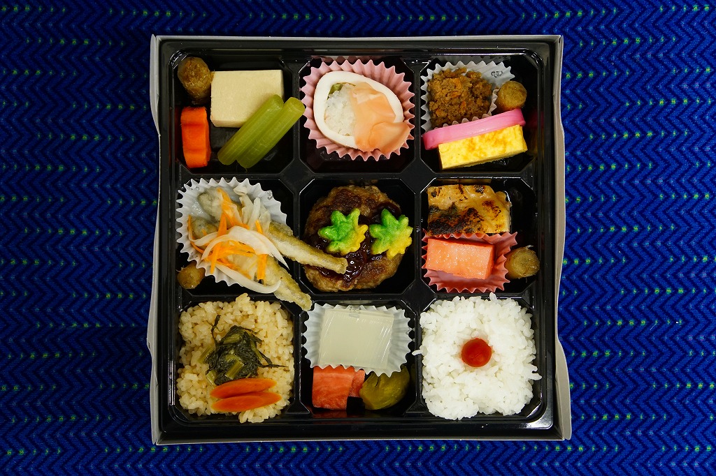 市販の大きな仕出し弁当容器を、もっと大きな掛紙で包む。9区画の中身は、日の丸御飯、茶飯と高菜漬、ワカサギ南蛮漬、煮物類、イカ山菜寿司、かまぼこと玉子焼と肉味噌、鶏味噌焼とナガイモ煮、漬物と甘味、つくね。このうち、肉味噌とハンバーグのようなつくねに、「ジビエ」こと鹿肉が使われる。食べれば臭みも美味もなく、牛や豚にしては細かくてざらざらしているな、と思う程度。半年間ほどの販売か。