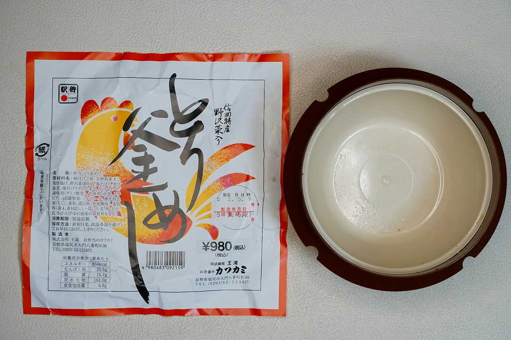 1980年代までには塩尻駅で発売か。釜飯駅弁向けプラ容器に、味付け御飯を詰め、とりそぼろ、野沢菜の油炒め、鶏唐揚で覆い、うずら卵、くり、紅生姜で彩る。そんな内容は、同じく塩尻駅の駅弁「とりめし」とほぼ同じ。飯も肉も油っぽいところも同じ。値段も容器も、こちらが少し高級品か。他の釜飯駅弁にない、素朴な感じを受ける。価格は2003年時点で820円、2014年時点で860円、2021年時点で970円、2023年時点で980円。