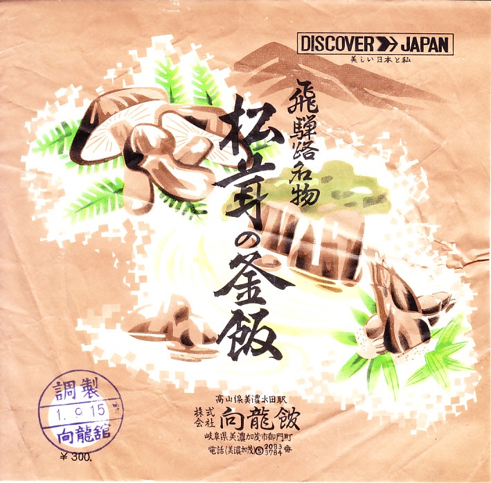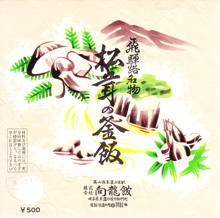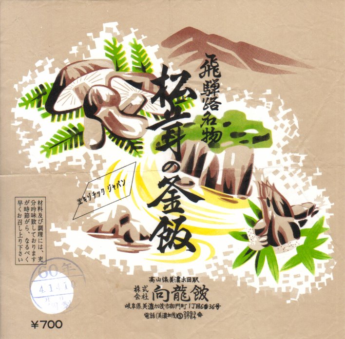 1960年代のものと思われる、昔の美濃太田駅弁の掛紙。21世紀まで生き残った「松茸の釜飯」とは別に、この四季の釜飯があったらしい。マツタケとシイタケやタケノコに日本ラインとその山並みを描いたように見える絵柄も、おそらく容器も、松茸の釜飯と同じようなもの。