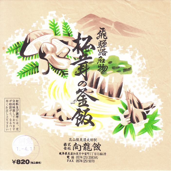 おそらく1990(平成2)年の、1月4日11時の調製と思われる、昔の美濃太田駅弁の掛紙。1989(平成元)年4月に消費税が導入され、1990(平成2)年には松茸の釜飯が900円に値上げされたので、その間となる。絵柄は下記の昭和時代と変わらない。