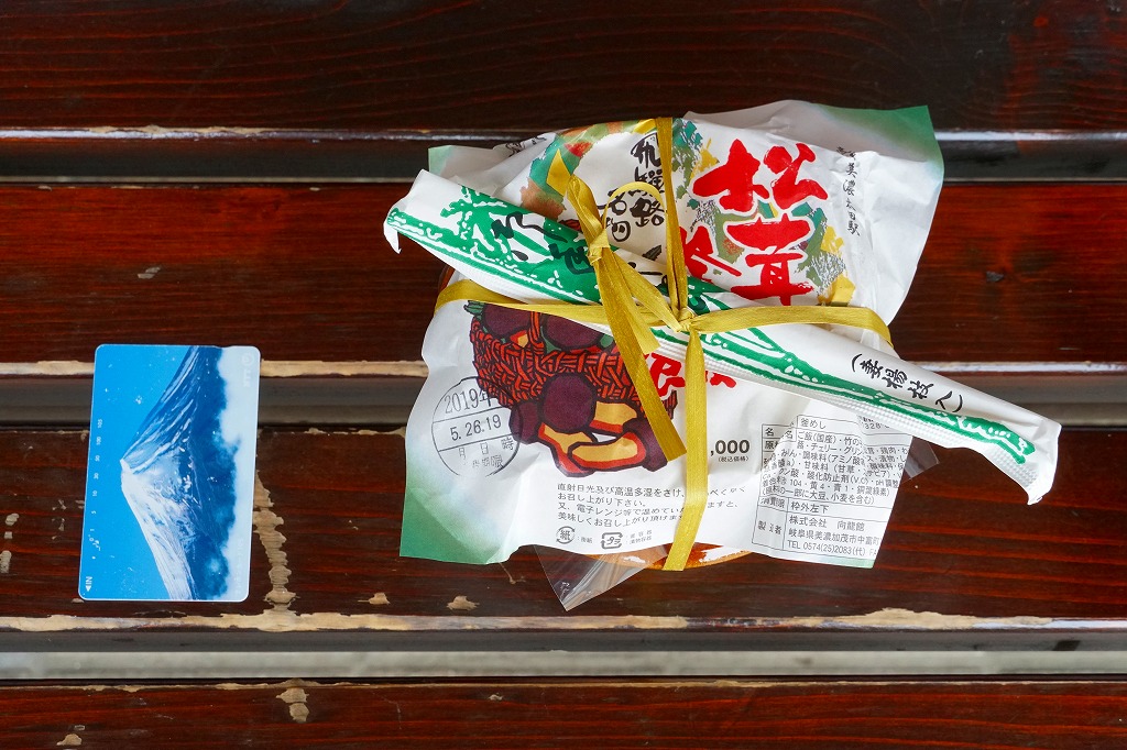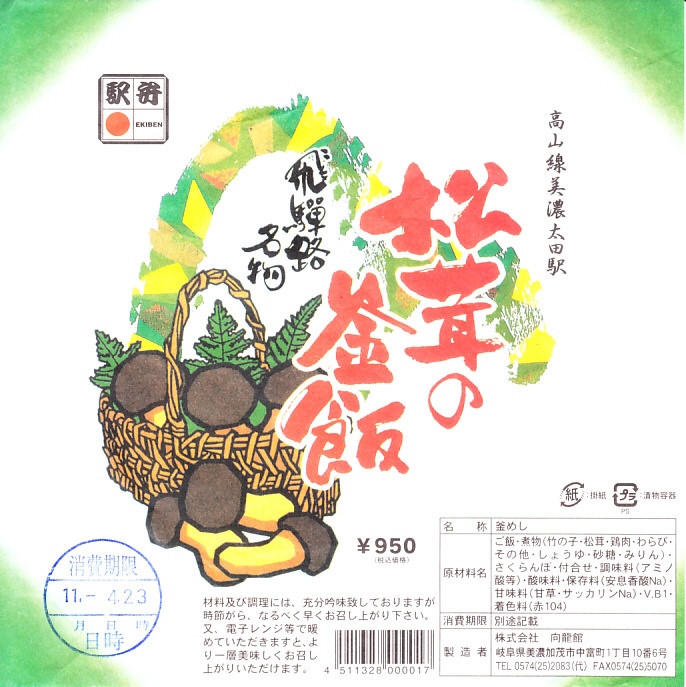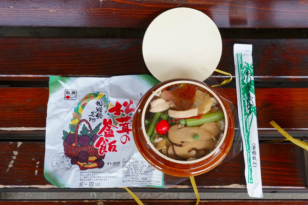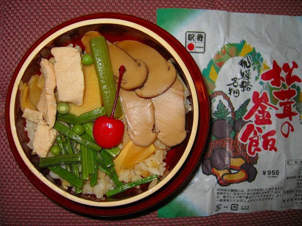 1959(昭和34)年に発売。「舟弁当」なきあと、美濃太田駅で最も有名な駅弁であり、駅で普通に買えた唯一の駅弁。ふたまで陶製の釜飯容器に、山や松茸や必要な情報を描いた薄手の掛紙をかけて、ひもで十字にしばる。中身は茶飯の上に松茸、鶏肉、タケノコ、ワラビを載せて、グリーンピースを散らしてさくらんぼを添えるもの。