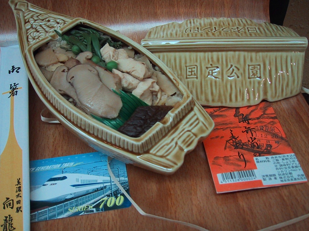 1962(昭和37)年に発売。駅弁の容器としては日本一級の複雑な形状を持つ美濃焼を用いる、駅弁通に知られた駅弁。日本ライン下りの屋形船をイメージした、容器のふたイコール屋根を持ち上げると、中身は茶飯の上に駅弁としては厚手の松茸に加えて椎茸や鶏やタケノコなどが乗る釜飯風松茸弁当。同じ駅の駅弁「松茸の釜飯」と、中身は同じ。食後は容器を小物入れや灰皿にすることが推奨される。