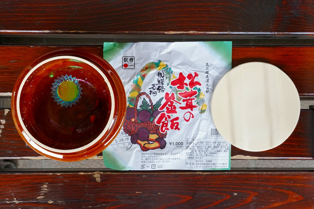 しかもこの駅弁は、立ち売りで売られた。美濃太田駅は、JR東海管内や中部地方で唯一、駅弁を立ち売りする駅であり、21世紀の時点で栃木県の宇都宮駅から福岡県の折尾駅までの巨大な空白を埋める貴重な存在だった。美濃太田駅は見た目でもはや、駅弁が売れる駅ではないだろうから、駅弁文化の維持と継承のために買い支えなければならないと思った。なお、美濃太田駅構内と特急列車「ひだ」の車内販売では、JRの指導により軽いプラ製の釜飯容器を使用していた模様。