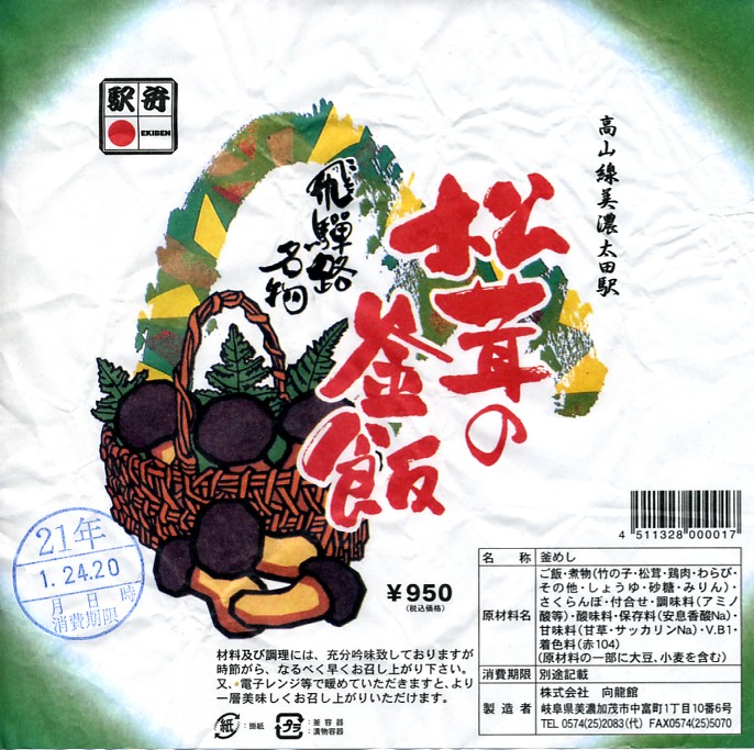 2001(平成13)年5月3日に購入した、昔の美濃太田駅弁の掛紙。この直後に駅弁資料館の制作を始めたことから、当館で昔という扱いをする最新の駅弁だと思う。立ち売りで買い、太多線の車内で食べた。アメリカからの外圧により、食品には調製(製造)年月日ではなく消費(賞味)期限を入れるよう国が指導するようになり、この駅弁も調製日時が不詳であるが、この頃の多くの駅弁では両者を併記した。