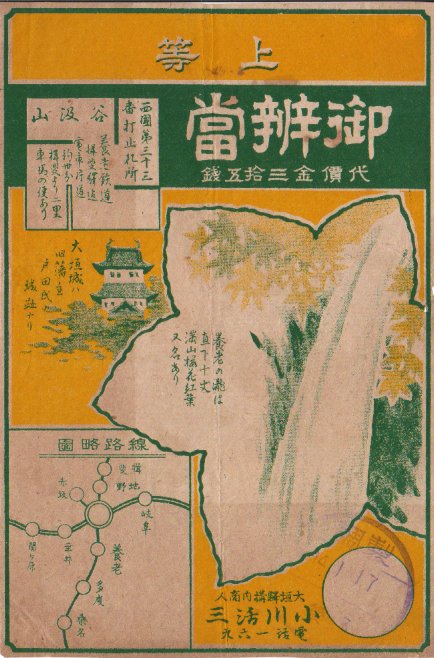 35銭の価格から、昭和14年でなく1925(大正14)年1月17日の調製と思われる、昔の大垣駅弁の掛紙。イラストで大垣城と養老の滝、そして交通案内で谷汲山が、名所として記される。