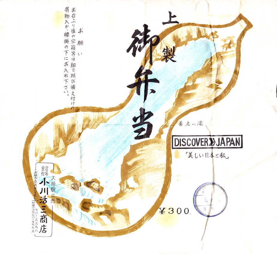 昭和30年代頃の、8月21日17時の調製と思われる、昔の大垣駅弁の掛紙。駅弁の名前は新字体なのに、価格が「百園」と旧字体。東京駅と大垣駅を結んだ夜行快速列車「ムーンライトながら」で大垣駅に乗り降りした度に、ここに駅弁があればよいのにと思った。ただ、もし駅弁が残っていても、春夏冬の「青春18きっぷ」の利用期間は人気列車の乗換競争や席取り合戦と混雑で駅弁どころではなく、そうでない期間は利用者が少なかったようで、駅弁があっても売りにくかったかもしれない。