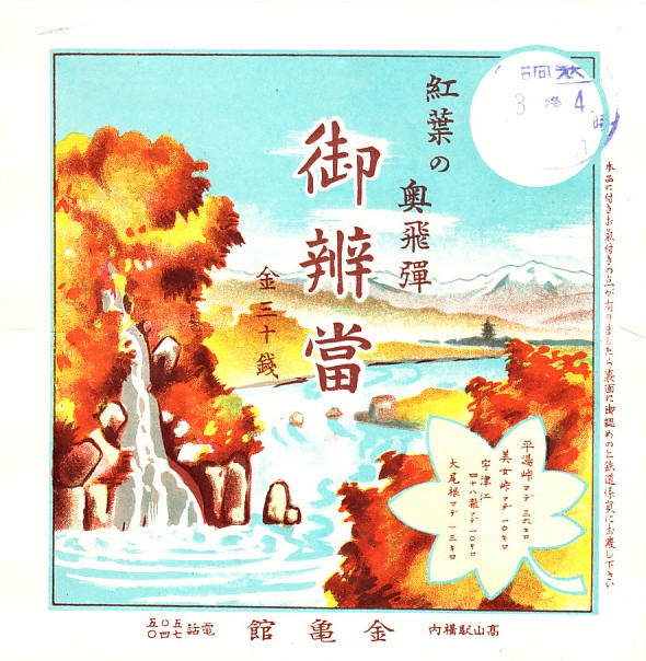 第二次大戦前の調製と思われる、昔の高山駅弁の掛紙。「紅葉の奥飛騨」が色鮮やかに描かれ、当館収蔵の駅弁掛紙の中で、最も美しいもののひとつだと思う。