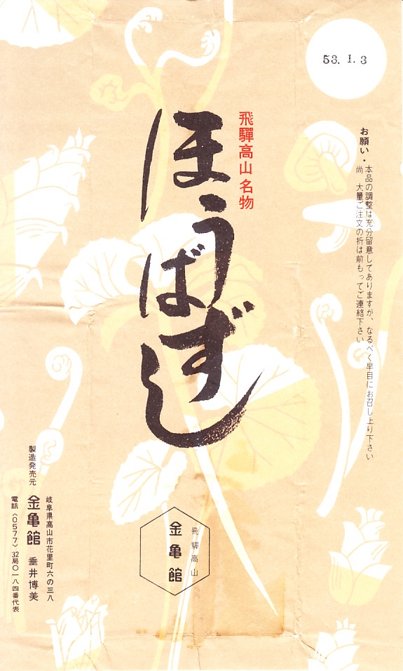 1978(昭和53)年1月3日の調製と思われる、昔の高山駅弁の掛紙。おそらく朴葉(ほうば)に酢飯とともに包んだであろう食材が、背景に並ぶ。