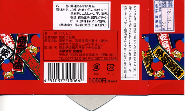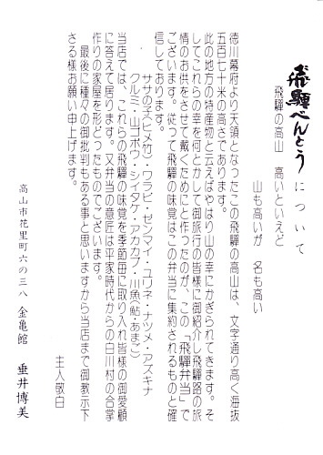 1973(昭和48)年1月12日の調製と思われる、昔の高山駅弁の掛紙。この絵柄と名前は高山駅弁の定番として変えないのではと思っていたが、上記のとおり2008年に名前を変えてしまった。