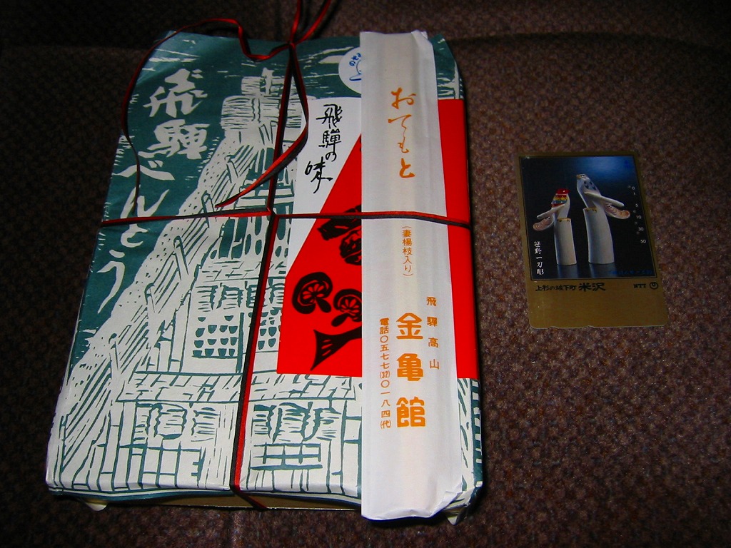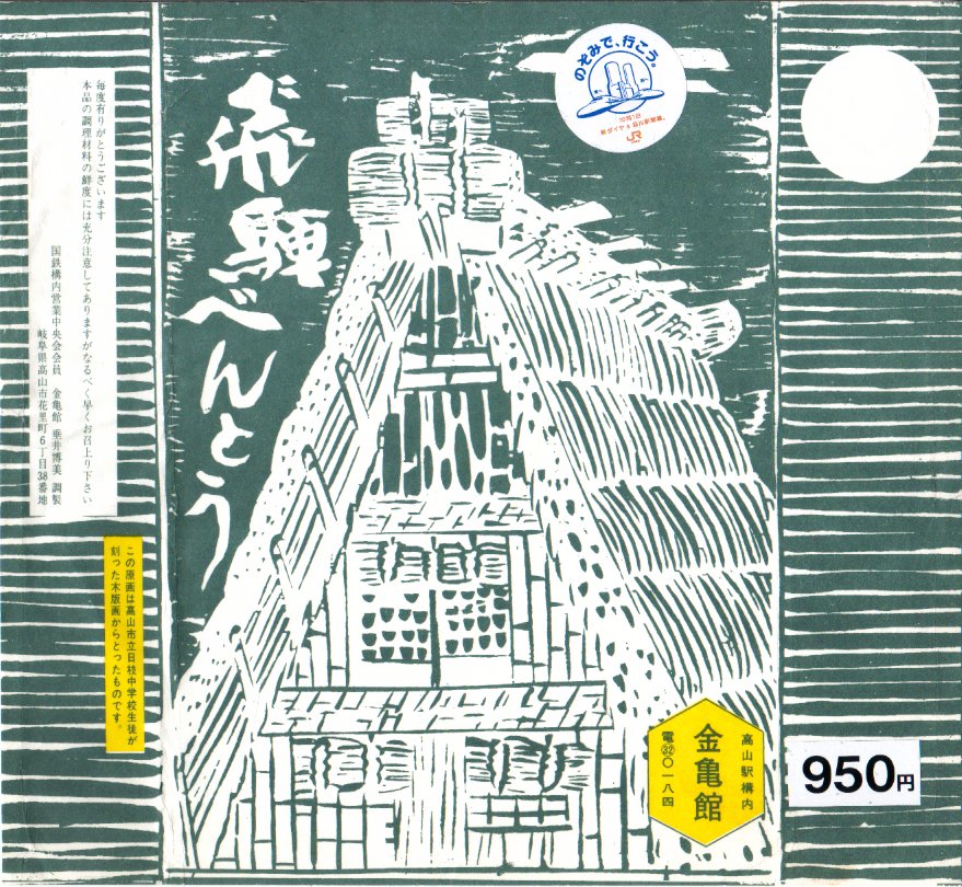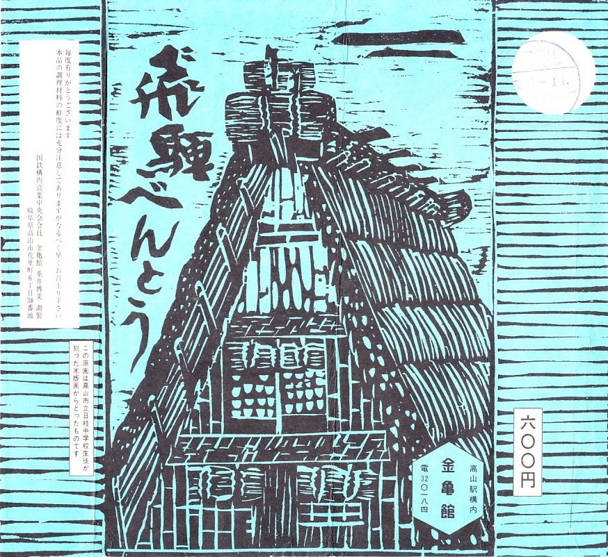 2008(平成20)年2月に、東海北陸自動車道の全線開通を記念して、下記の駅弁「飛騨べんとう」をリニューアル。1960年発売の「飛騨べんとう」の、白川郷などにある合掌造りの建物をモチーフにした、高山市立日枝中学校生徒が彫った木版画による掛紙の絵柄と、中身の山の幸という具材やその配置を承継した。