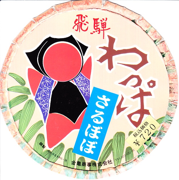 入手状況から1989年頃のものと思われる、昔の高山駅弁のふた。容器や中身は上記の現行品とだいたい同じか。価格を税込み720円に訂正しており、1989年4月の消費税導入からほどない頃のものか。