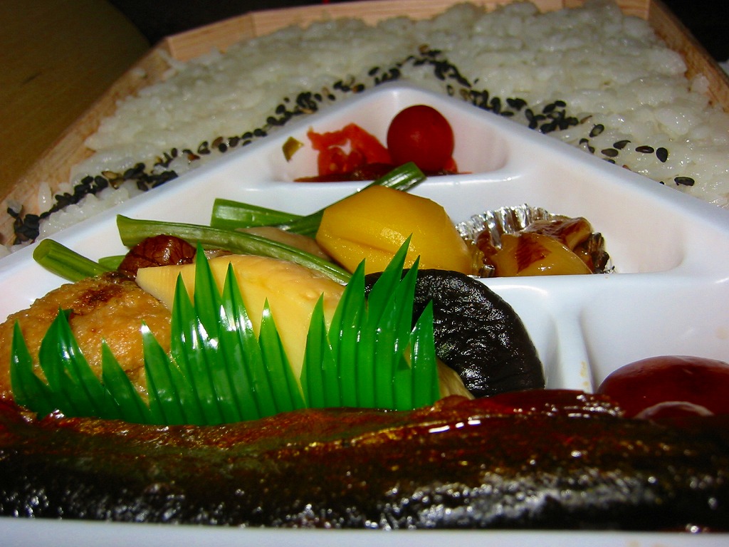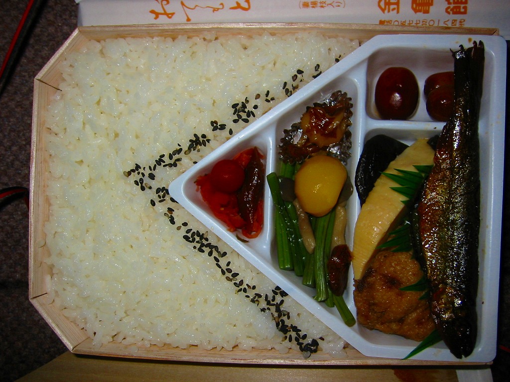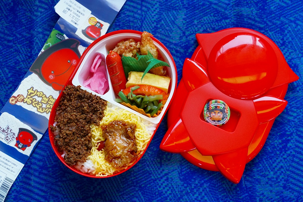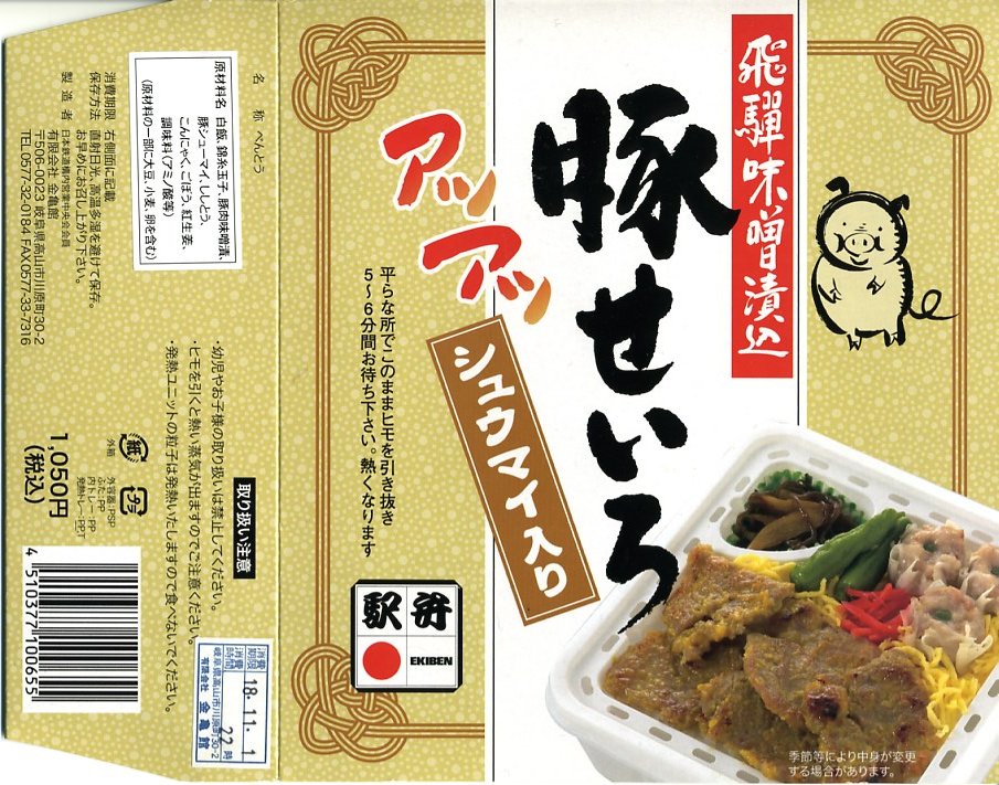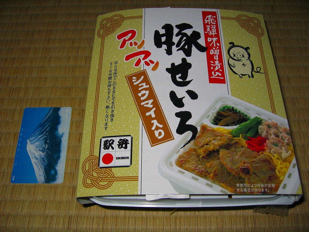 2006(平成18)年10月に発売。正方形の加熱機能付き容器を、中身写真と駅弁の名前を書いたボール紙の枠にはめる。中身は白御飯の上を焦げ目のある豚肉味噌漬と豚焼売で覆い、ししとうと紅生姜を載せてこんにゃくごぼうを添えるもの。中身に着色料と刺激臭を提供してしまった紅生姜が別添であれば、見栄えや風味や分量や品質について文句なし。現存しない模様。