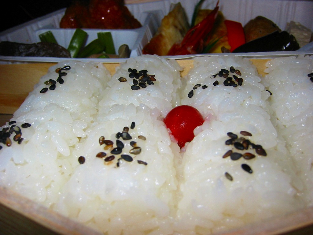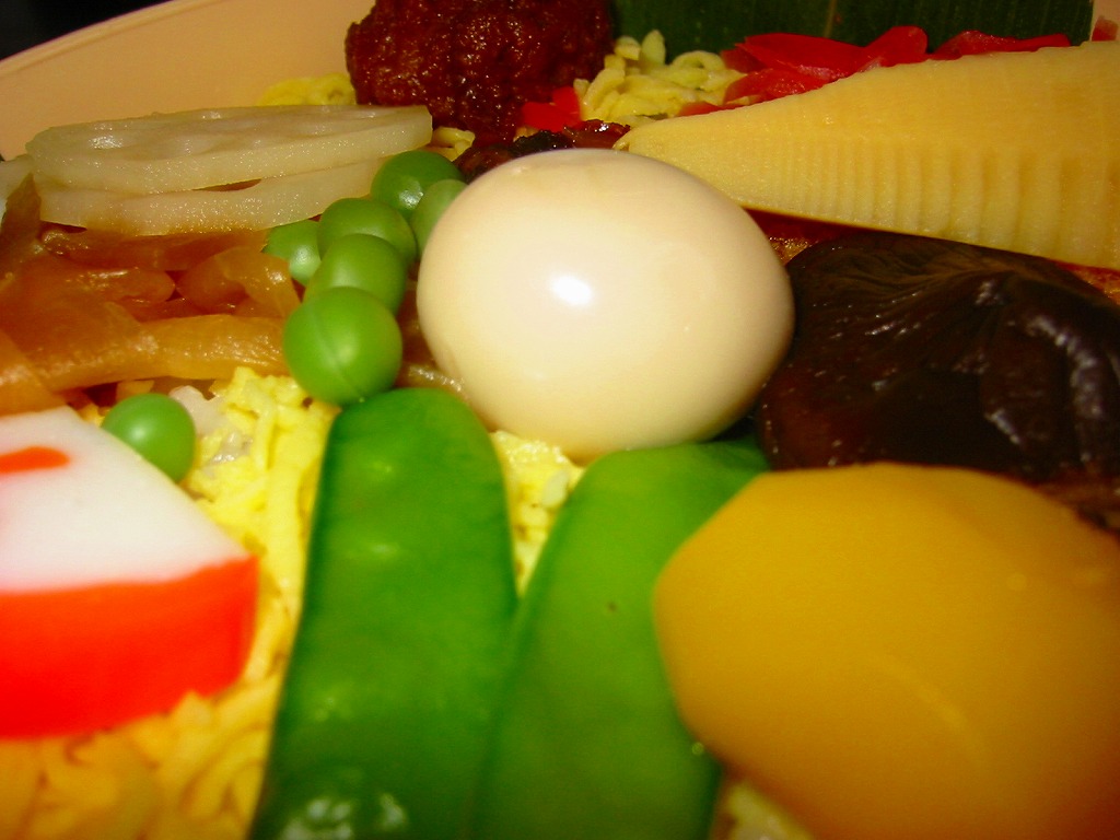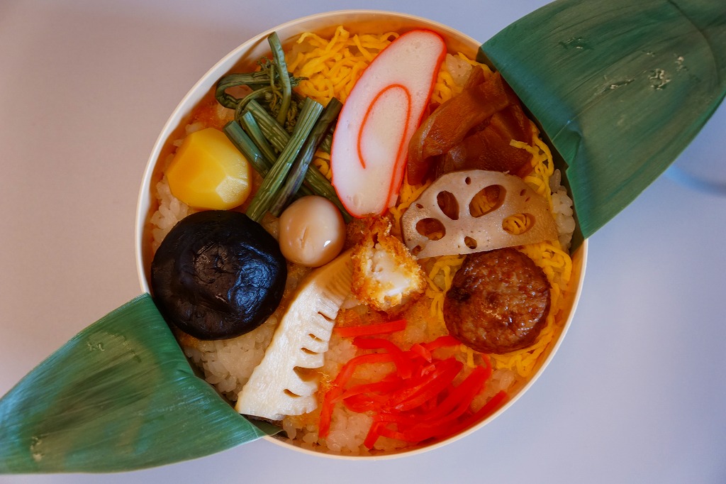 中身の写真は横長のため右に90度回転させたが、おかずを手前下部に、御飯を奥の上部に配置するのは、合掌造りの茅葺きの黒屋根に白い雪が降り、黄色い雲と赤い太陽が輝く意図でつくられている。その御飯と錦糸卵と黒ごまと梅干しに、れんこんの天ぷらと山菜とアンズやくりなどと、タケノコやフキなどの煮物と、山くらげと大根の漬物を詰める。