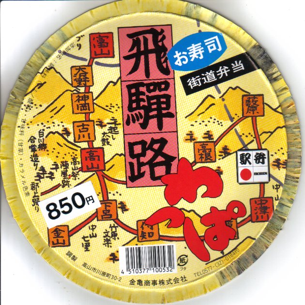 2003(平成15)年10月10日に購入した、高山駅弁のふた。絵柄はかつての街道のルートをイメージか。「飛騨路わっぱ」の容器や中身は、上記の2017年のものとほぼ変わらない。御飯は夏には味付飯、冬には酢飯になると紹介された。